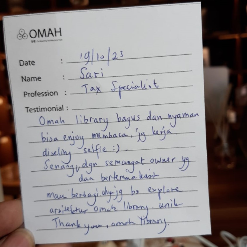 OMAH library bagus dan nyaman bisa enjoy membaca juga kerja diseling selfie:) Senang dengan semangat owner dan berterimakasih mau berbagi. Oh ya juga bisa explore arsitektur OMAH library, unik. Thank you OMAH library.
