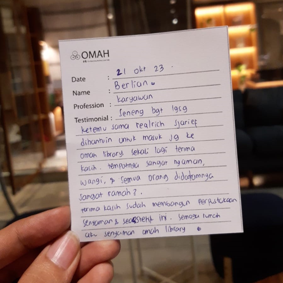 Seneng banget langsung ketemu sama Realrich Sjarief dibantuin untuk masuk juga ke OMAH library. Sekali lagi terimakasih. Tempatnya sangat nyaman, wangi & semua orang didalamnya sangat ramah-ramah. Terimakasih sudah membangun perpustakaan senyaman & se-aesthetic ini. Semoga rumah aku senyaman OMAH library<3