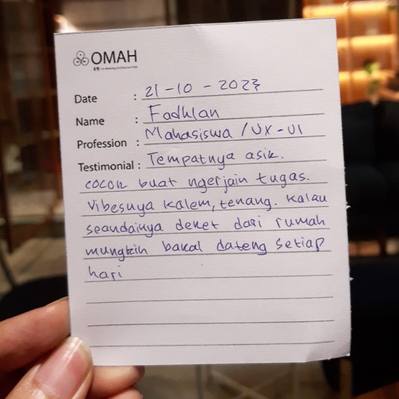Tempatnya asik, cook buat ngerjain tugas. Vibes-nya kalem, tenang. Kalau seandainya deket dari rumah mungkin bakal dateng setiap hari.