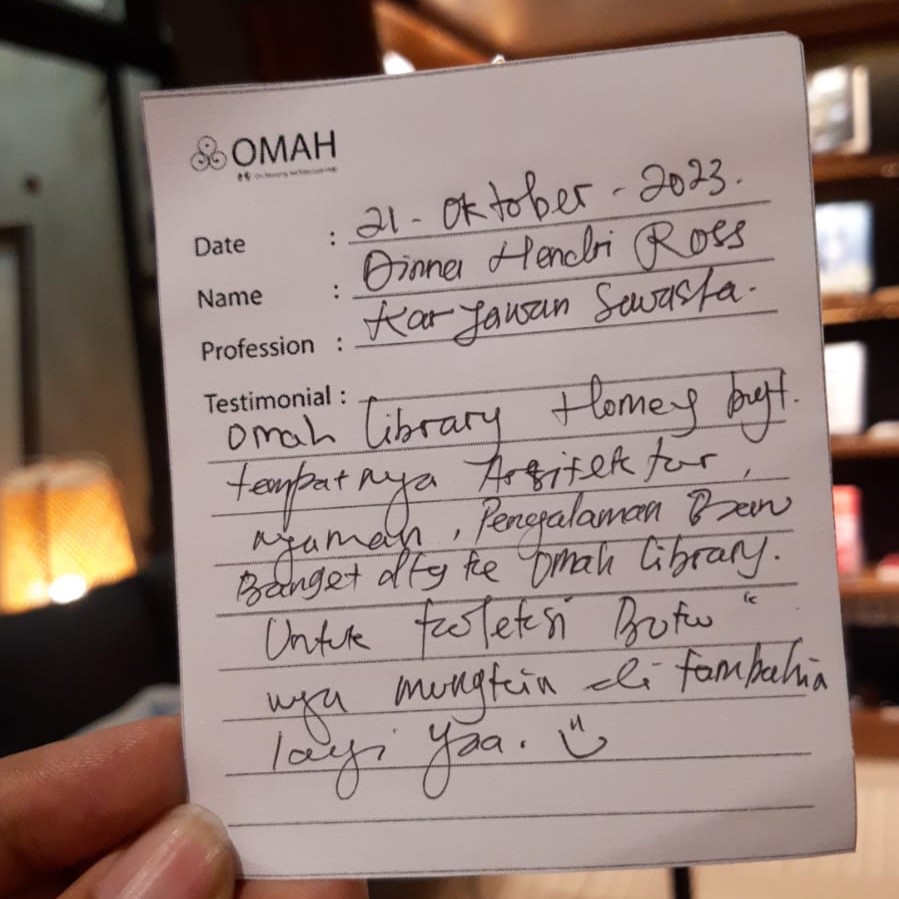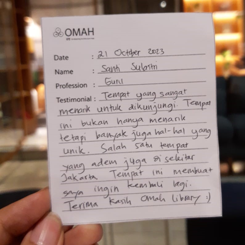 OMAH library homey banget. Tempatnya arsitektur, nyaman, pengalaman baru banget datang ke OMAH library. Untuk koleksi bukunya mungkin di tambahanin lagi ya:)