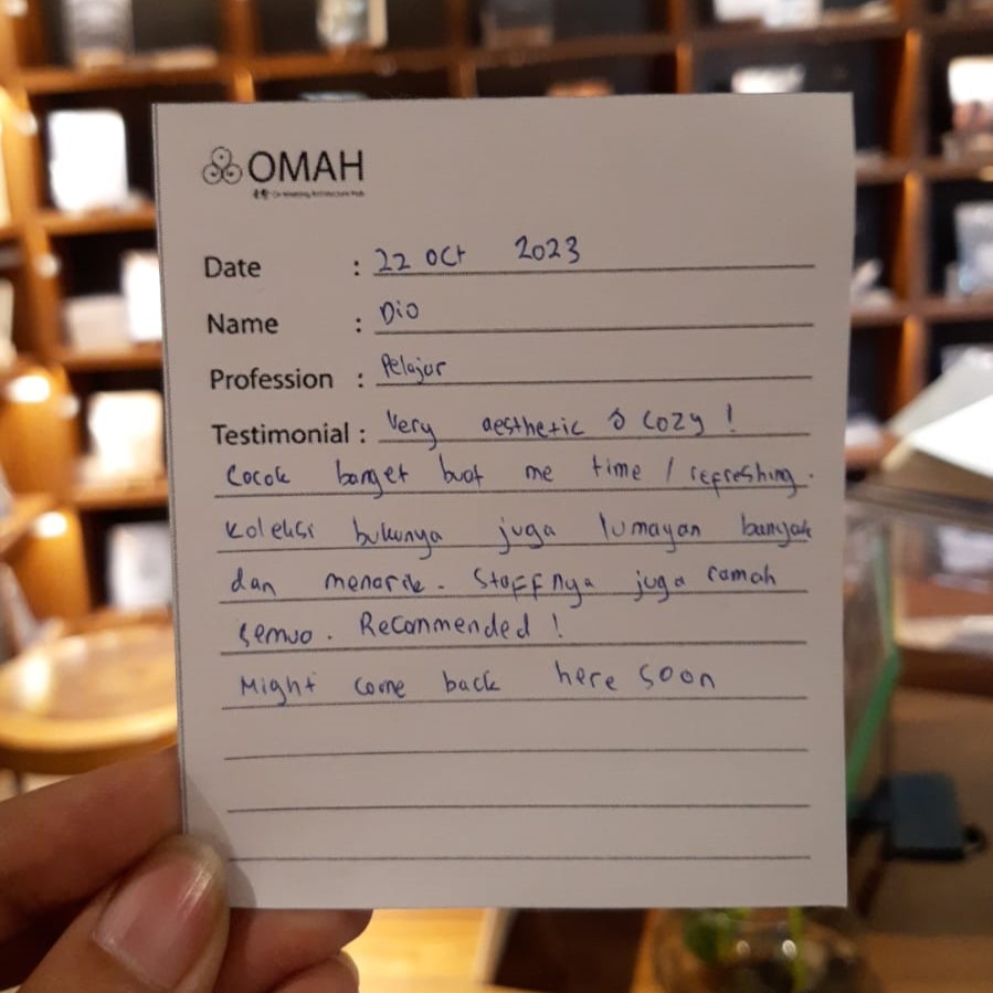 Very aesthetic & cozy! Cocok banget buat me time/refreshing. Koleksi bukunya juga lumayan banyak dan menarik. Staff-nya juga ramah semua. Recommended! Might come back here soon.