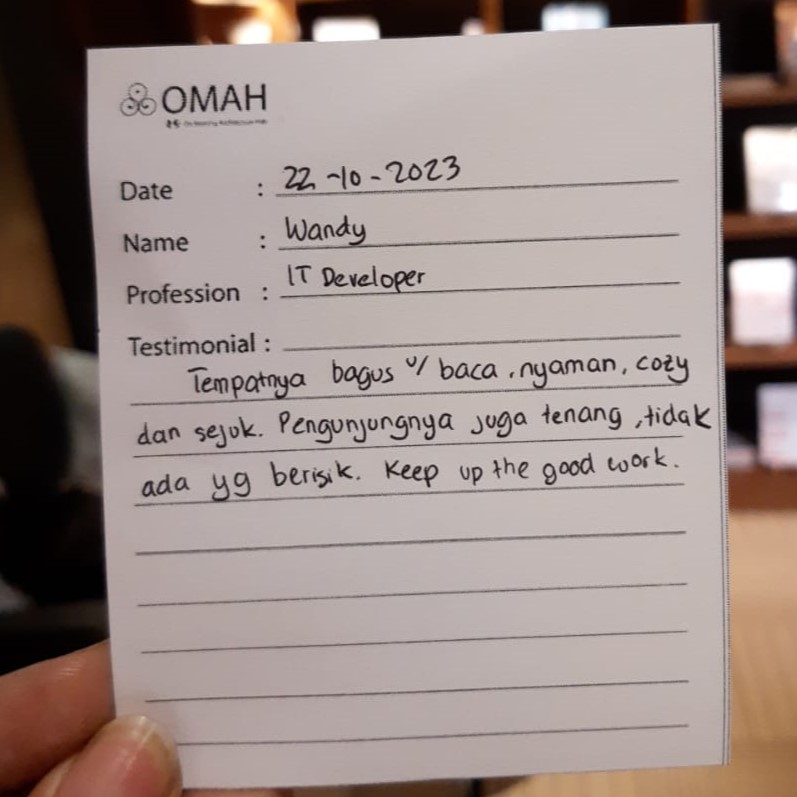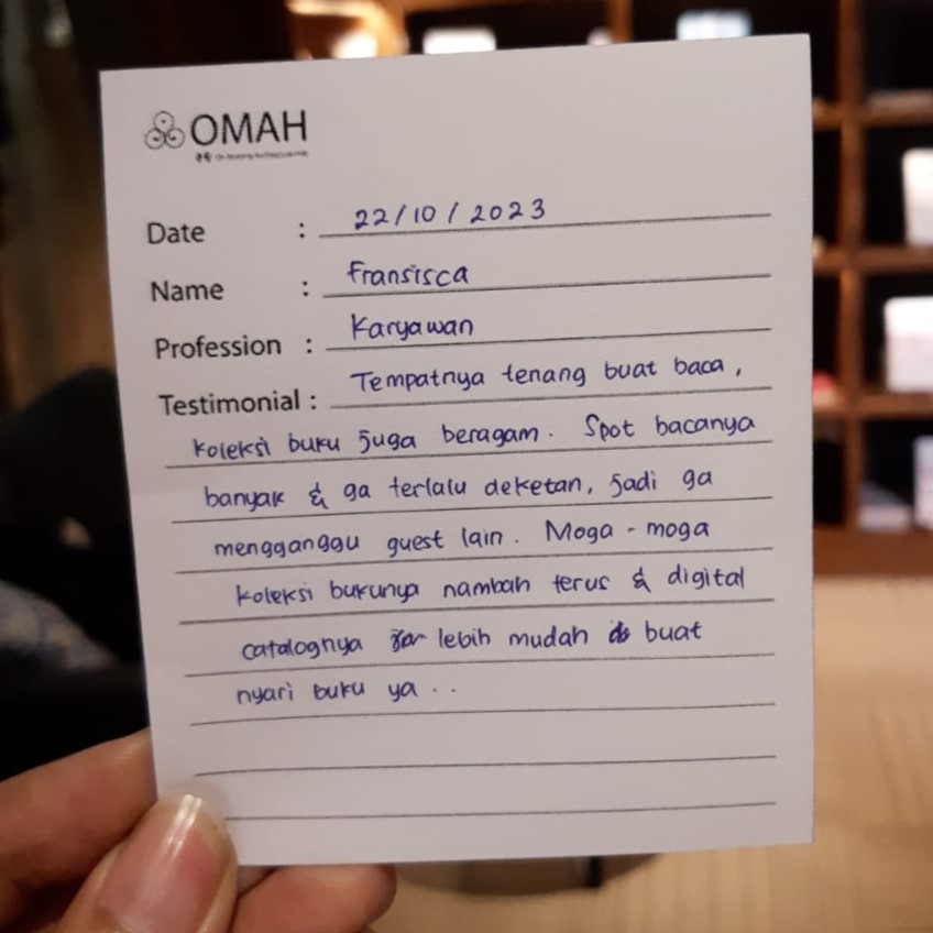 Tempatnya tenang buat baca, koleksi buku juga beragam. Spot bacanya banyak & ga terlalu deketan, jadi ga mengganggu guest lain. Moga-moga koleksi bukunya nambah terus & digital catalognya lebih mudah buat nyari bukunya ya…