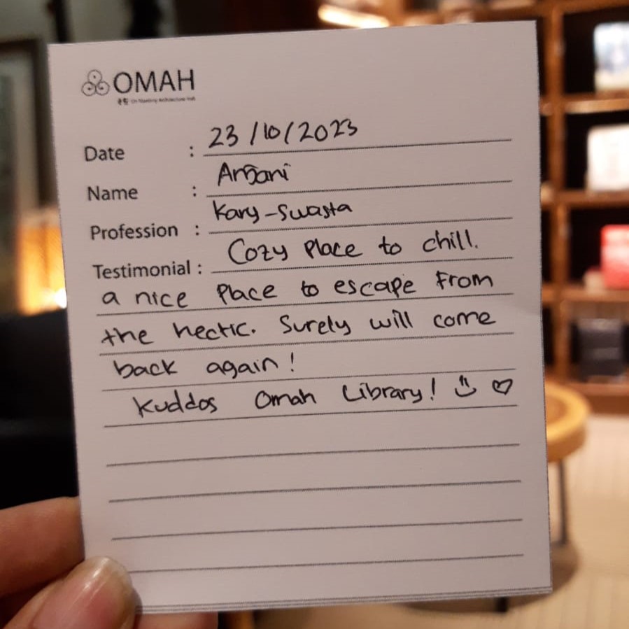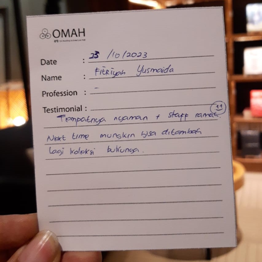 Tempatnya nyaman + staff ramah. Next time mungkin bisa ditambah lagi koleksi bukunya.