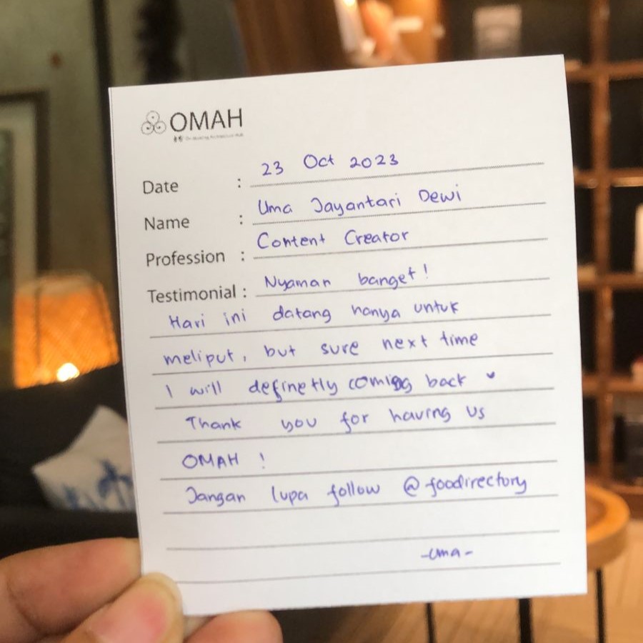 Nyaman banget! Hari ini datang hanya untuk meliput, but sure next time i will definitely coming back. Thank you for having us OMAH! jangan lupa follow @foodirectory.
