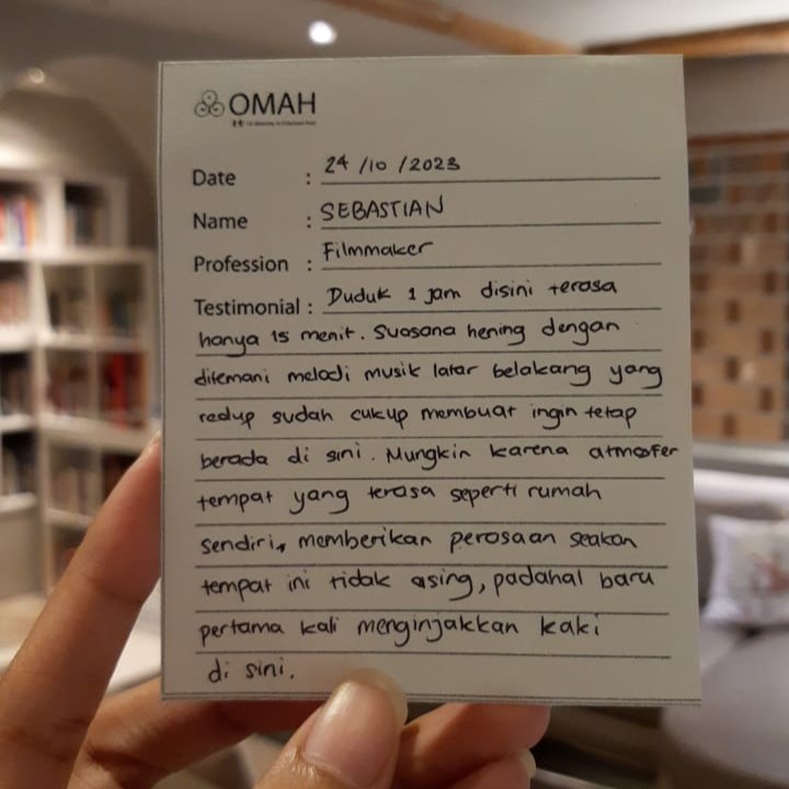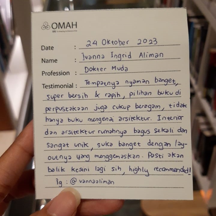 Tempatnya nyaman banget, super bersih & rapih, pilihan buku di perpustakaan juga cukup beragam, tidak hanya buku mengenai arsitektur. Interior dan arsitektur rumahnya bagus sekali dan sangat unik, suka banget dengan layout-nya yang menggemaskan. Pasti akan balik kesini lagi sih, highly recommended!