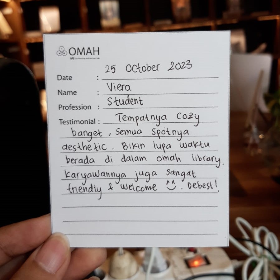 Tempatnya cozy banget, semua spotnya aesthetic. Bikin lupa wktu berada didalam OMAH library. Karyawannya juga sangat friendly & welcome:) Debest!