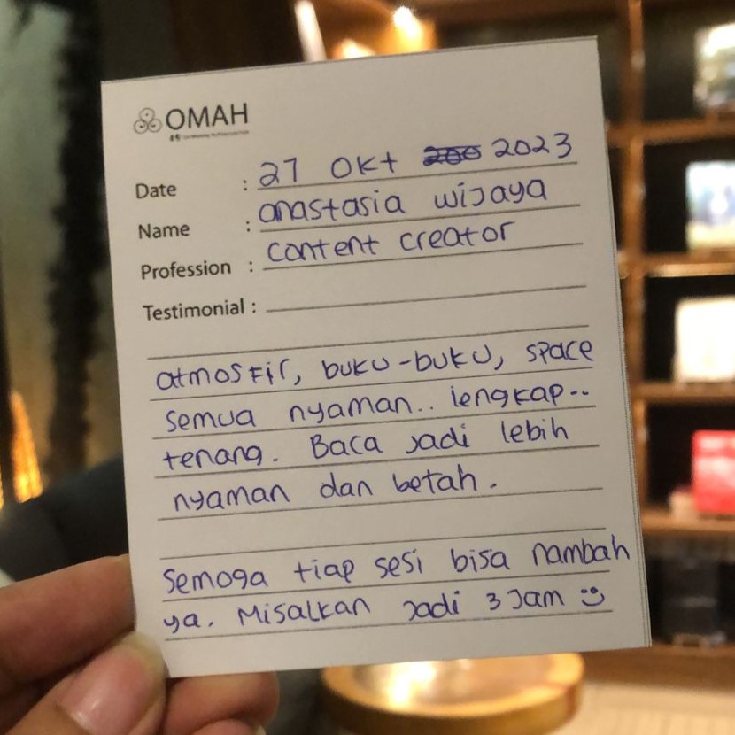 Atmosfir, buku-buku, space semua nyaman, lengkap, tenang. Baca jadi lebih nyaman dan betah. Semoga tiap sesi bisa nambah ya. Misalkan jadi 3 jam:)