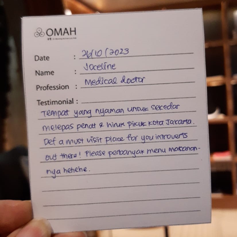 Tempat yang nyaman untuk sekedar melepas penat & hiruk pikuk kota Jakarta. Definitely a must visit place for you introverts out there! Please perbanyak menu makanannya hehehe.