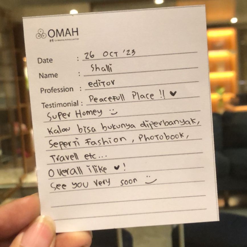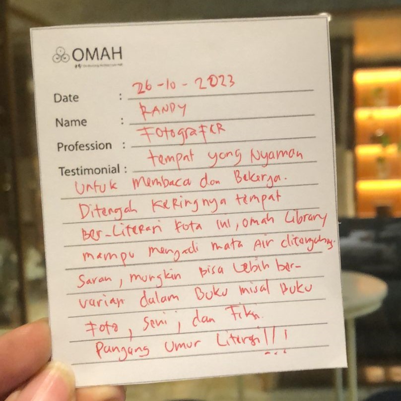 Tempat yang nyaman untuk membaca dan bekerja. Ditengah keringnya tempat ber-literasi kota ini, OMAH library mempu menjadi mata air di Tangerang. Saran, mungkin bisa lebih bervarian dalam buku misal buku foto, seni dan fiksi. Panjang umur litersi!!!