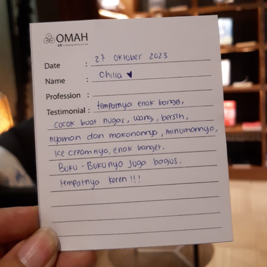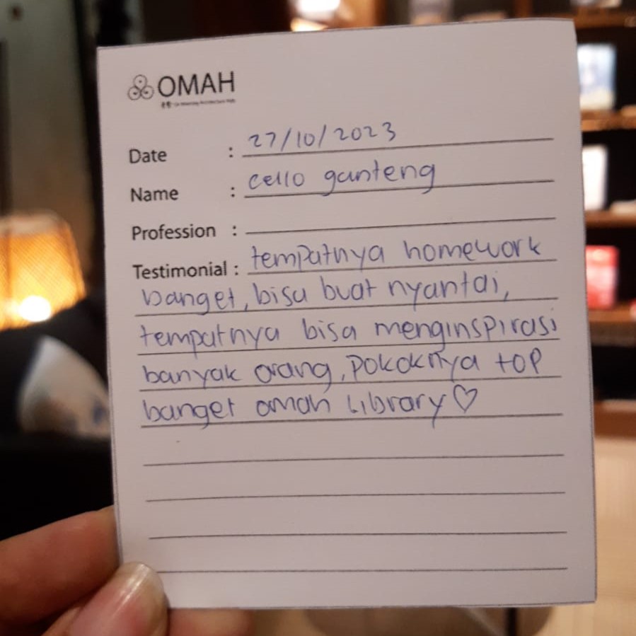 Tempatnya homework banget, bisa buat nyantai, tempatnya bisa mengisnpirasi banyak orang, pokoknya top banget OMAH library<3