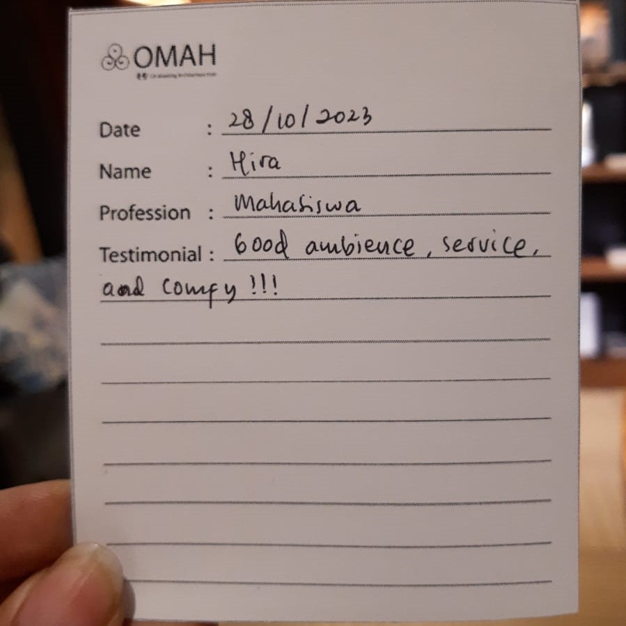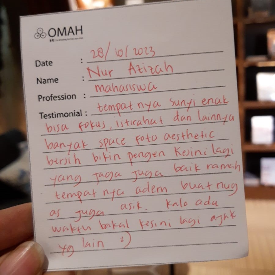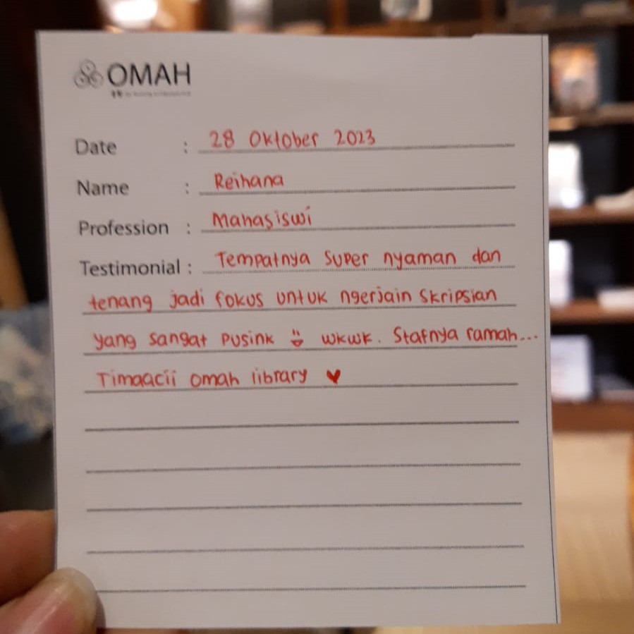 Tempat-nya super nyaman dan tenang jadi fokus untuk ngerjain skripsian yang sagat pusing wkwk. Staff-nya ramah. Trimaacii OMAH library ❤