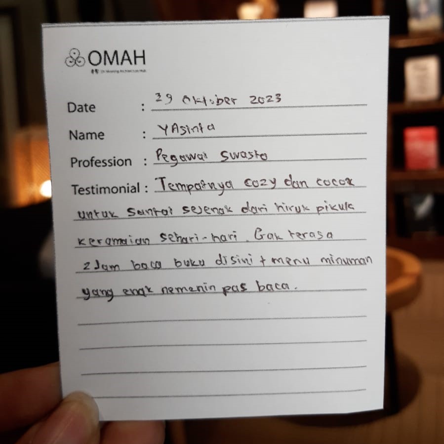 Tempat-nya cozy dan cocok untuk santai sejenak dari hiruk pikuk keramaian sehari-hari. Gak terasa 2 jam baca buku disini + menu minuman yang enak nemenin pas baca.