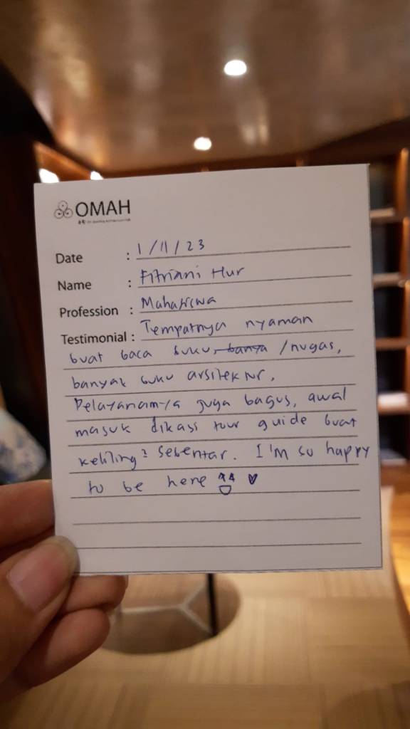 Tempat-nya nyaman buat baca buku/nugas, banyak buku arsitektur, pelayanannya juga bagus, awal masuk dikasi tour guide buat keliling-keliling sekitar. I’m so happy to be here.