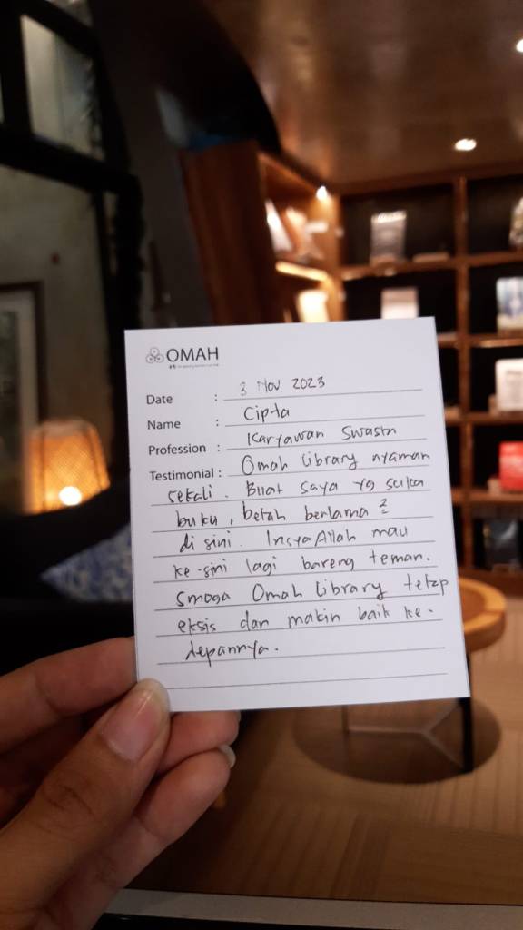 OMAH library nyaman sekali. Buat saya yang suka buku, betah berlama-lama disini. InsyaAllah mau kesini lagi bareng teman. Semoga OMAH library tetap eksis dan makin baik kedepannya.