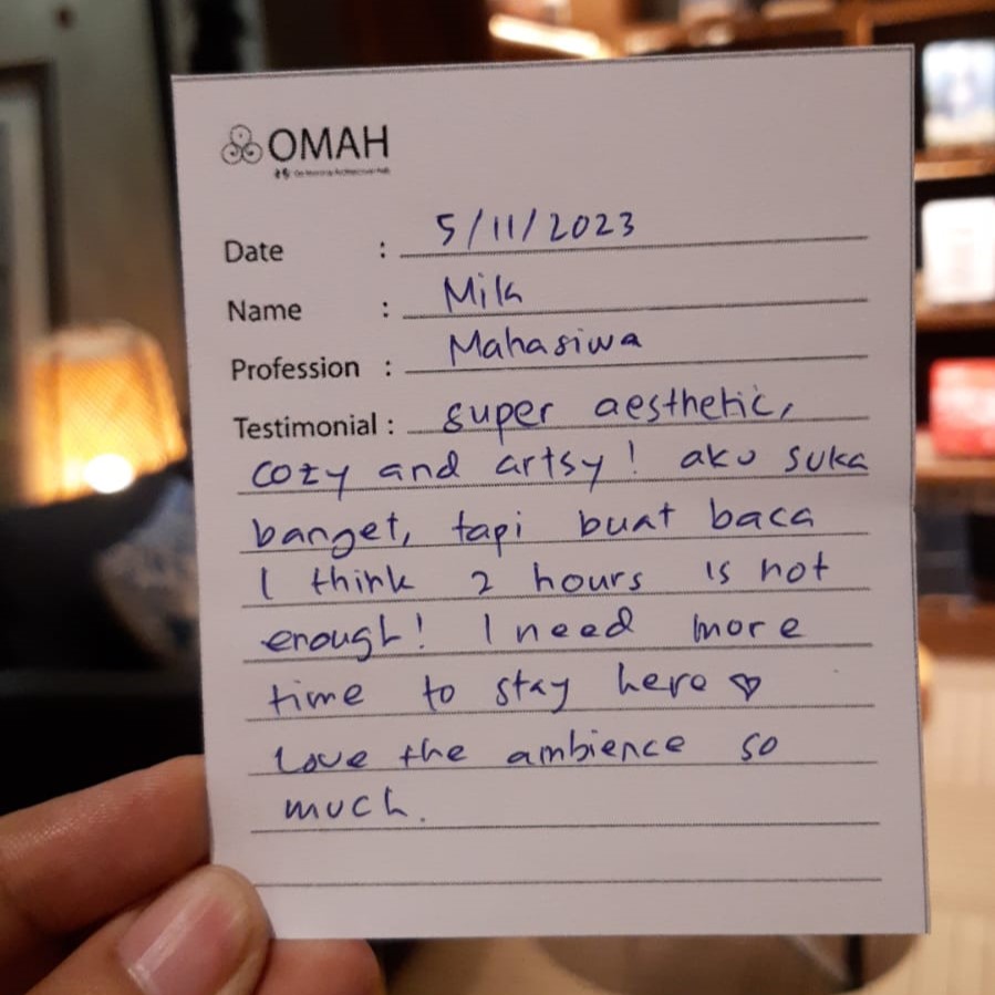 Super aesthetic, cozy and artsy! aku suka banget, tapi buat baca i think 2 hours is not enough! I need more time to stay here ❤ Love the ambience so much.