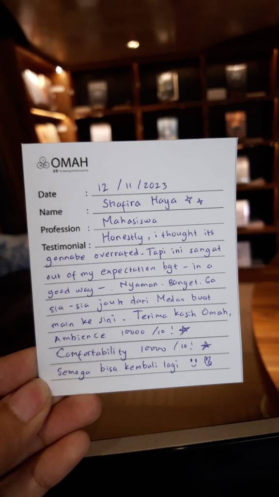 Honestly, i thought it’s gonnabe overrated. Tapi ini sangat out of my expectation banget – in a good way- Nyaman banget. Ga sia-sia jauh dari Medan buat main ke sini. Terima kasih Omah, ambience 10000/10!☆ Comfortability 10000/10! * Semoga bisa kembali lagi 🙂