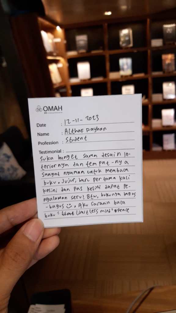 Suka banget sama desain interior-nya dan tempat-nya sangat nyaman untuk membaca buku. Jujur, baru pertama kali kesini dan pas kesini dapat pengalaman seru! Btw, buku-nya bagus-bagus, Aku saranin baca buku Limitless mind peace.