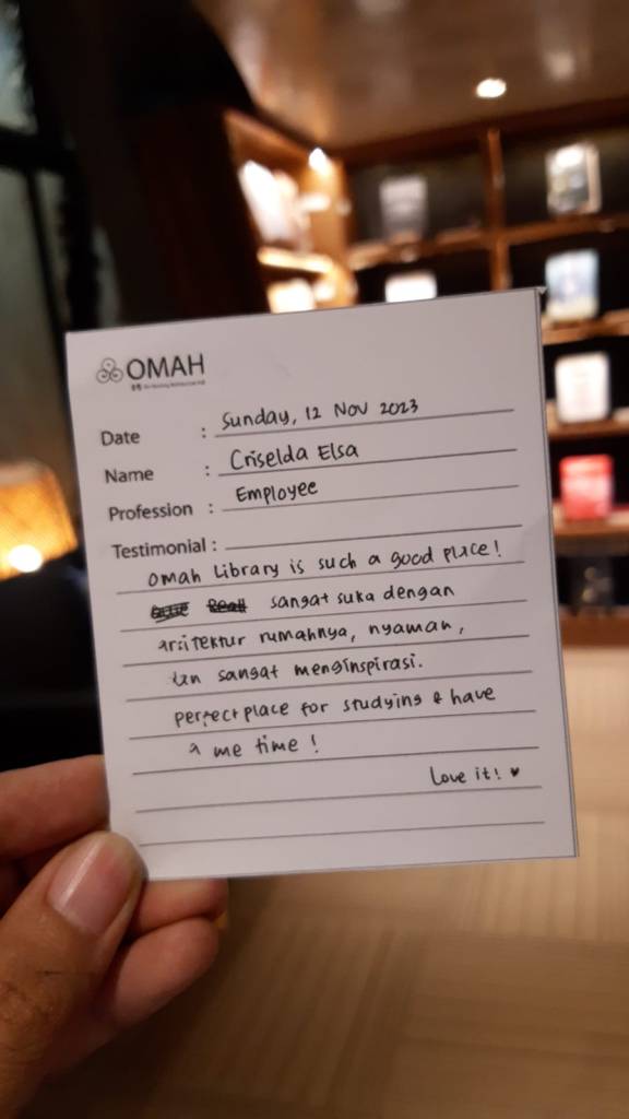 OMAH library is such a good place! Sangat suka dengan arsitektur rumahnya, nyaman dan sangat menginspirasi. Perfect place for studying & have a me time! Love it!<3
