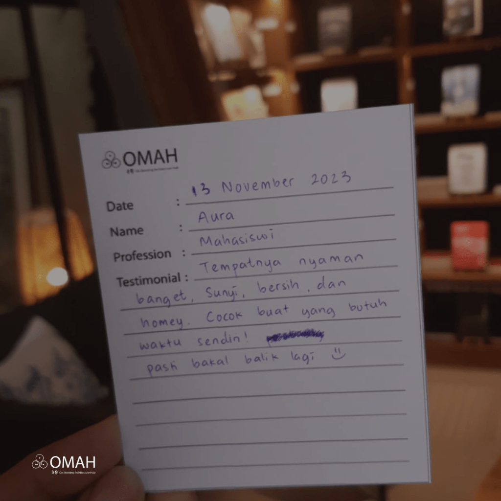 Tempatnya nyaman banget, sunyi, bersih, dan homey. Cocok buat yang butuh waktu sendiri! Pasti bakal balik lagi.