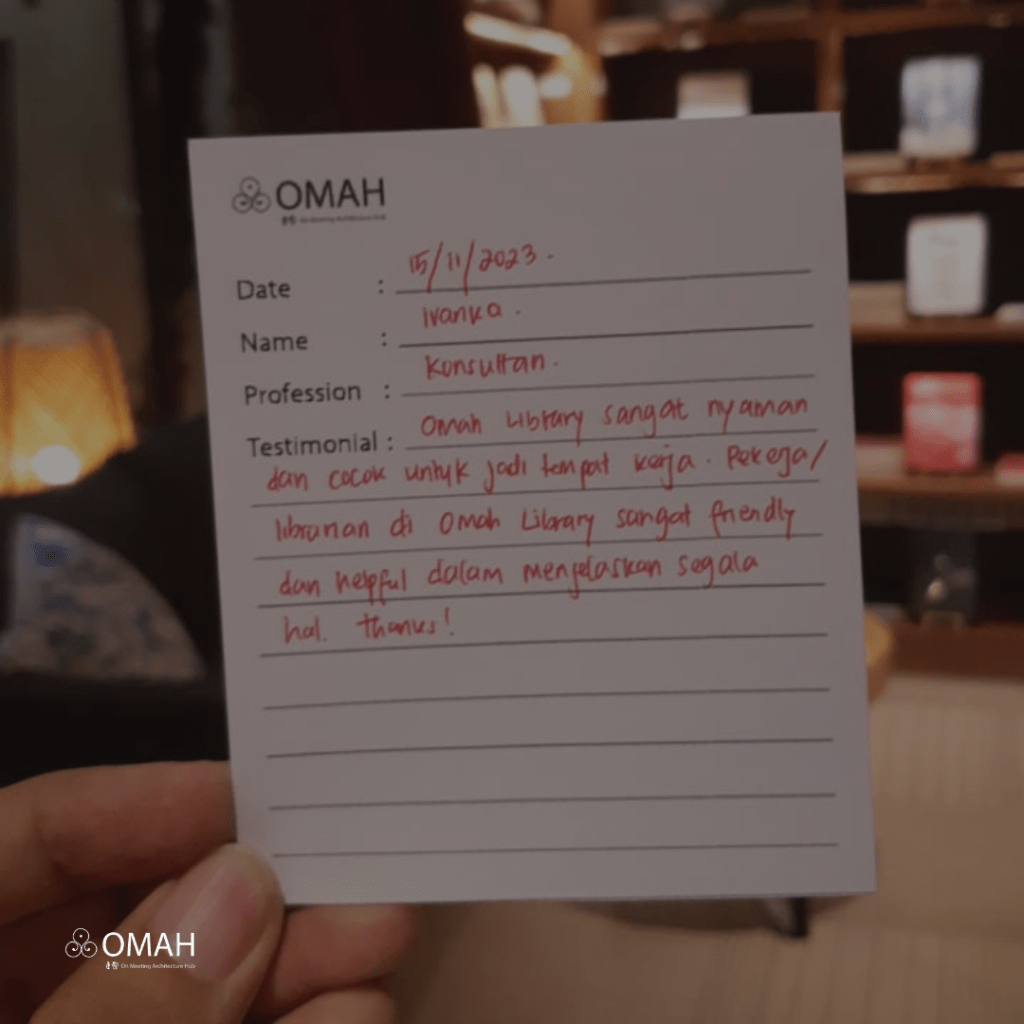 OMAH Library sangat nyaman dan cocok untuk jadi tempat kerja. Pekerja/Librarian di OMAH Library sangat friendly dan helpful dalam menjelaskan segala hal. Thanks !