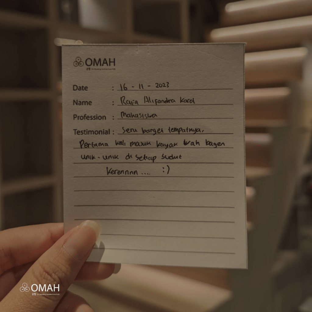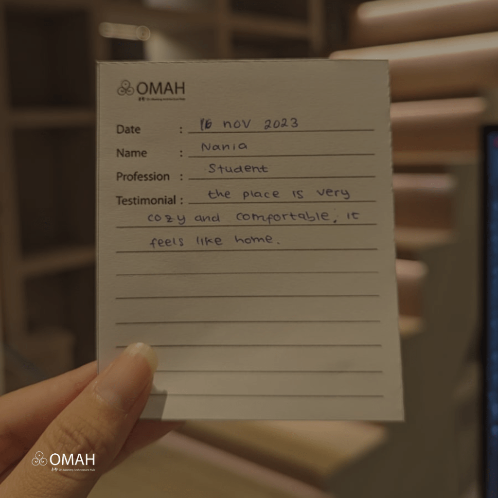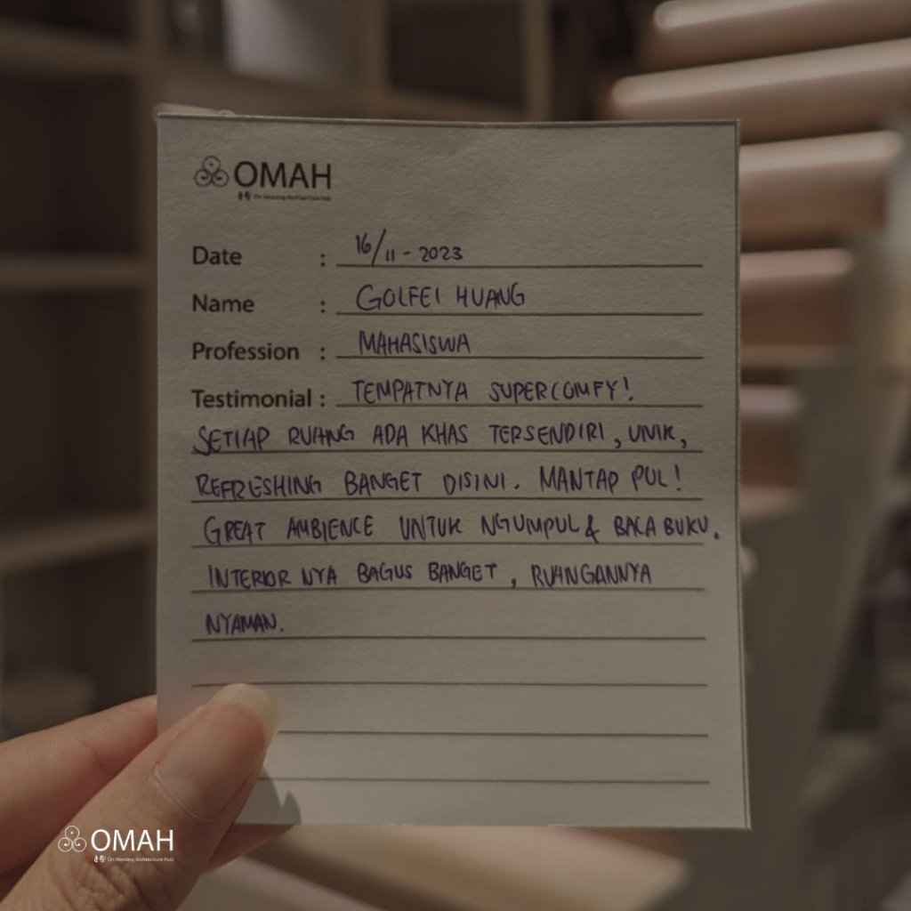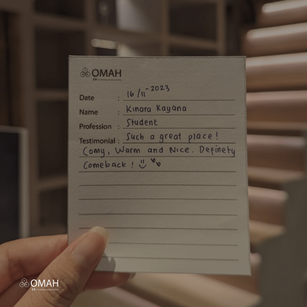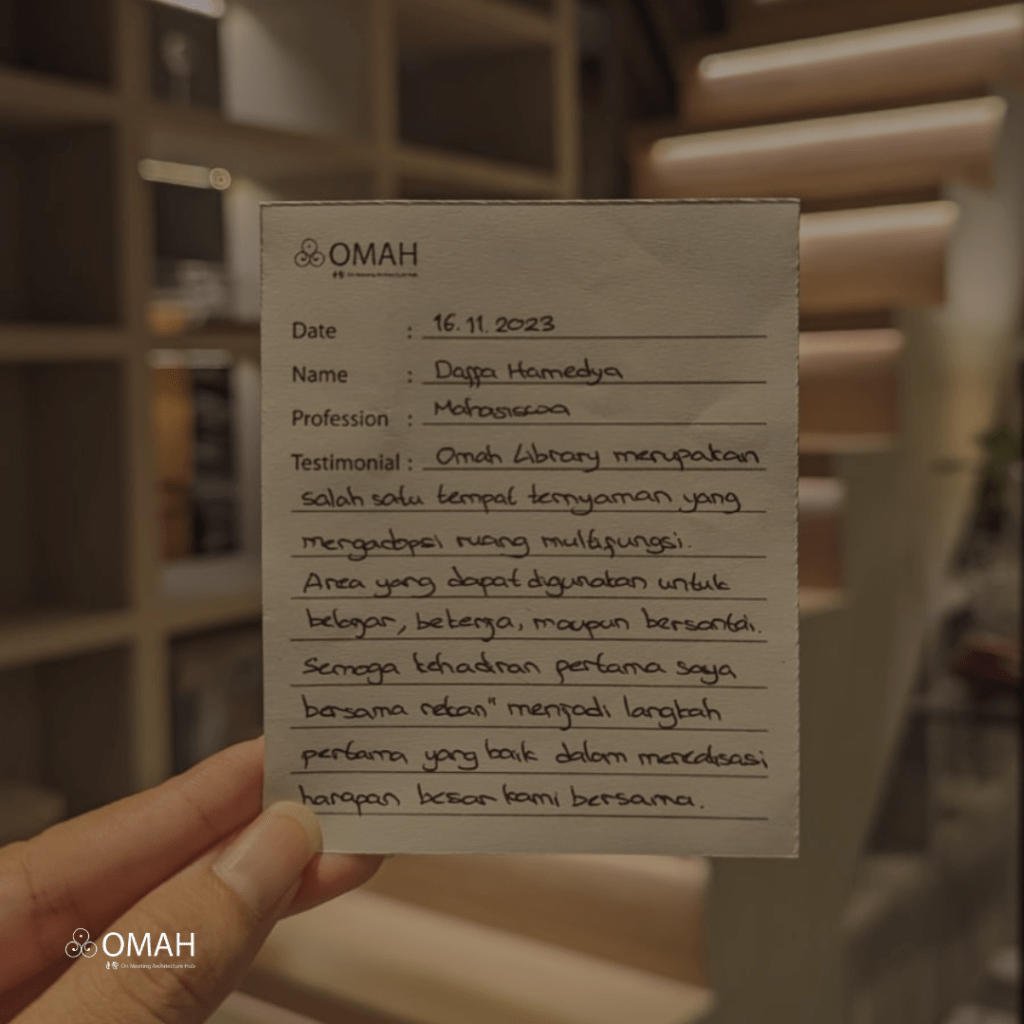 OMAH Library merupakan salah satu tempat ternyaman yang mengadopsi ruang multifungsi. Area yang dapat digunakan untuk belajar, bekerja, maupun bersantai. Semoga kehadiran pertama saya bersama rekan-rekan menjadi langkah pertama yang baik dalam merealisasi harapan besar kami bersama.