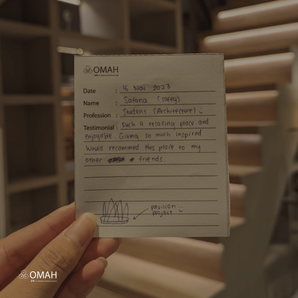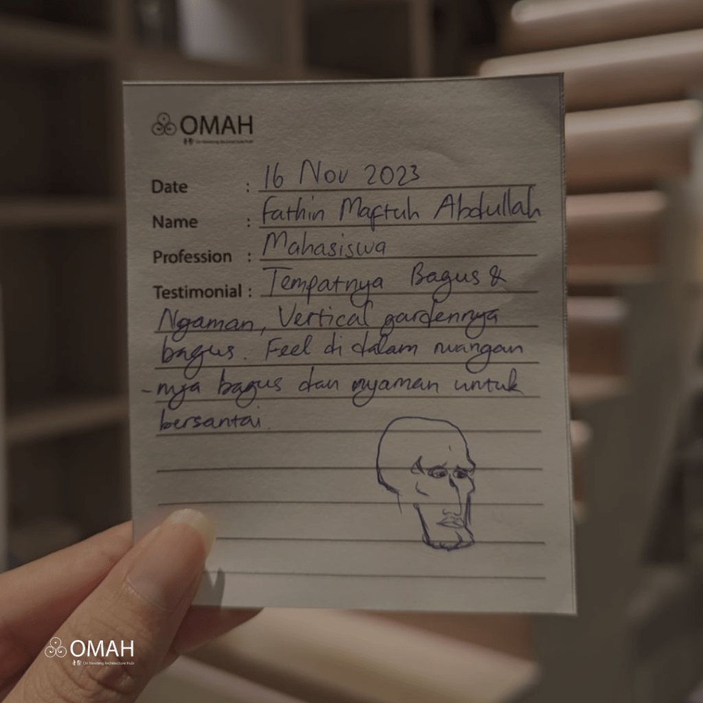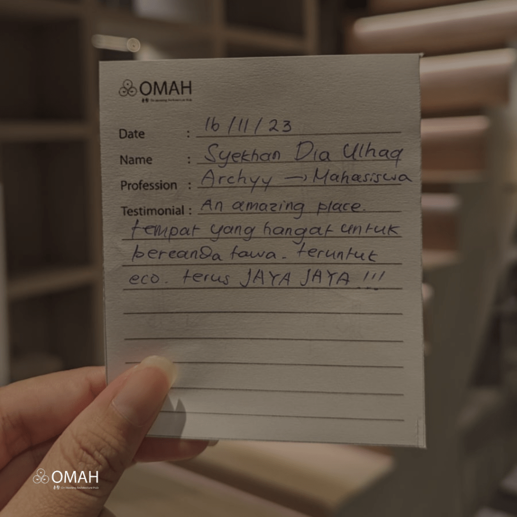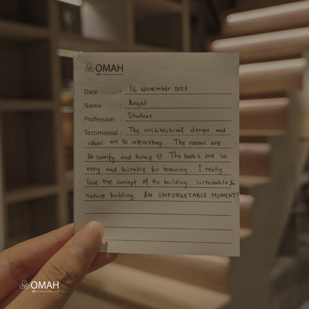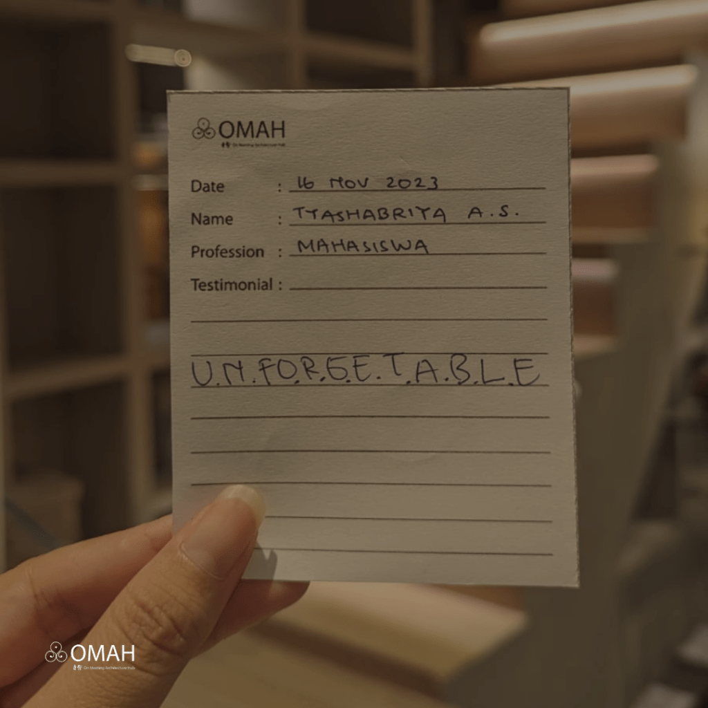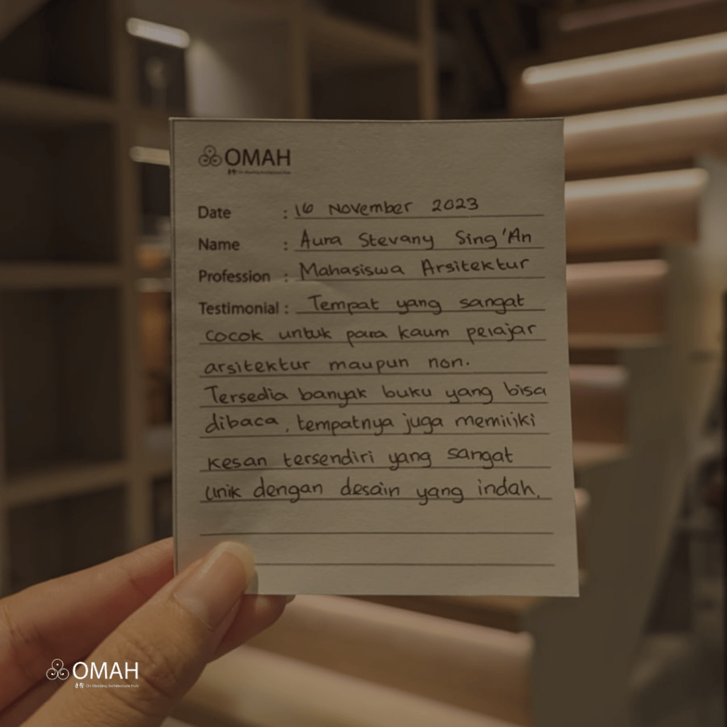 OMAH Library merupakan salah satu tempat ternyaman yang mengadopsi ruang multifungsi. Area yang dapat digunakan untuk belajar, bekerja, maupun bersantai. Semoga kehadiran pertama saya bersama rekan-rekan menjadi langkah pertama yang baik dalam merealisasi harapan besar kami bersama.