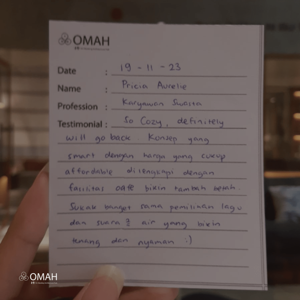 So cozy, definitely will go back. Konsep yang smart dengan harga yang cukup affordable dilengkapi dengan fasilitas cafe bikin tambah betah. Suka banget sama pemilihan lagu dan suara-suara air yang bikin tenang dan nyaman 🙂