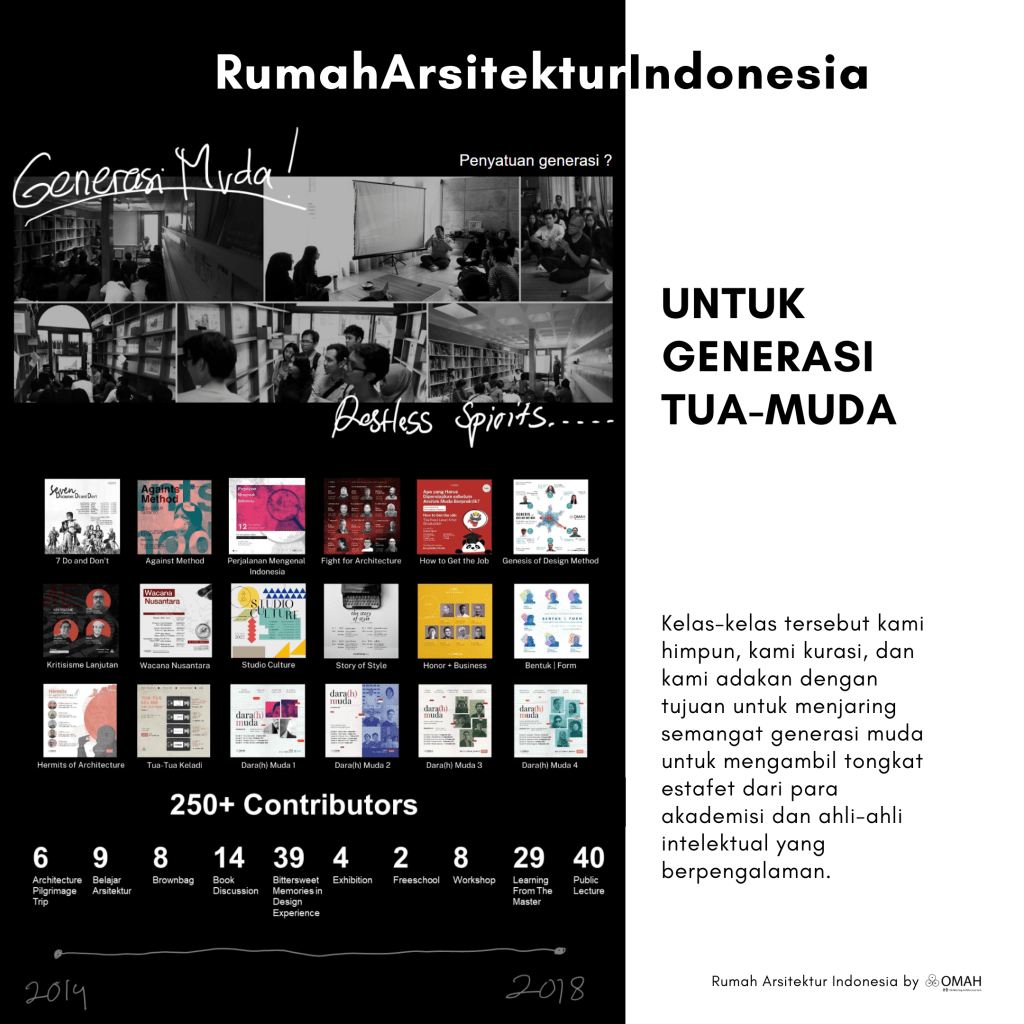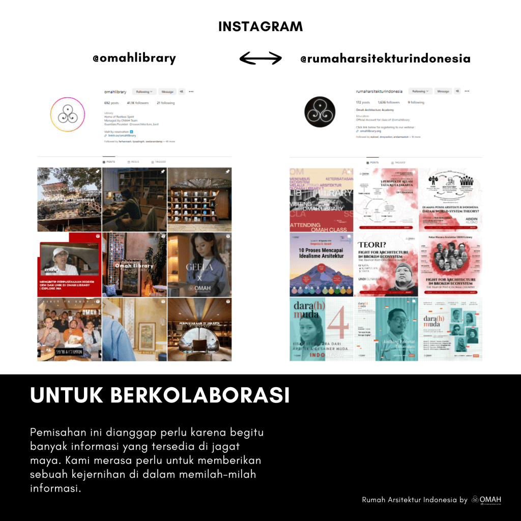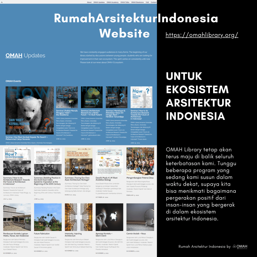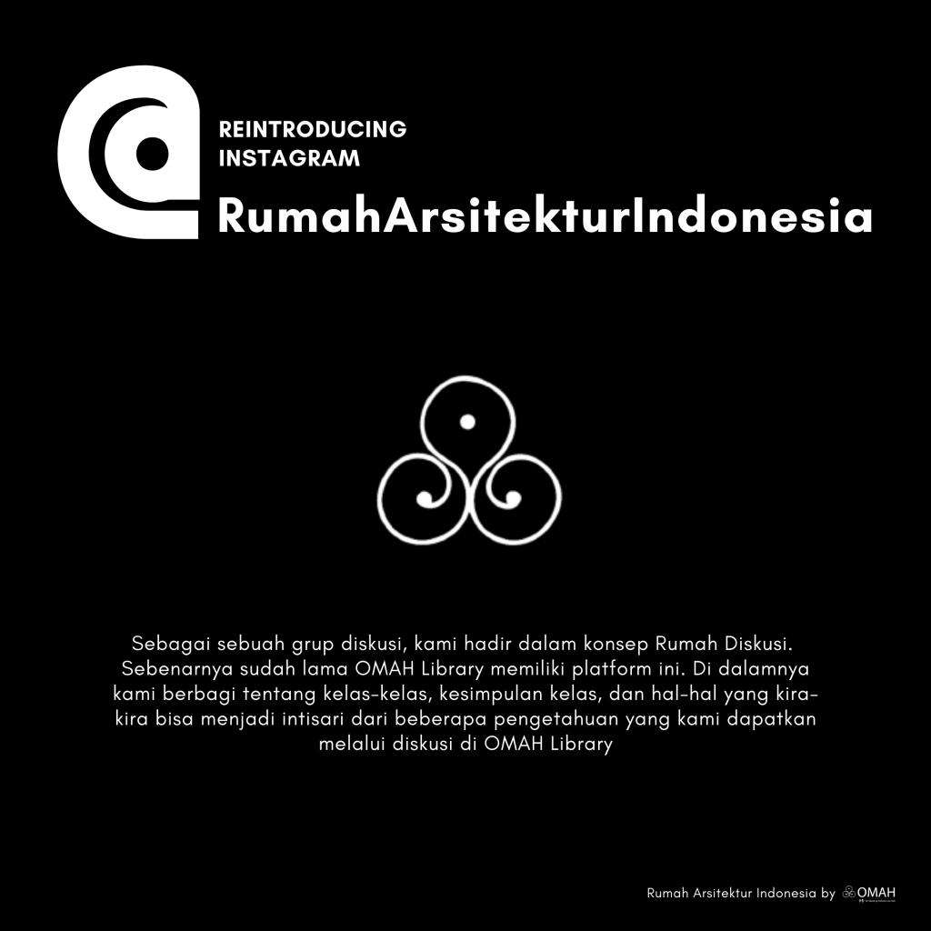 Halo teman-teman… OMAH Library memiliki sebuah platform yang bernama @rumaharsitekturindonesia , di situ kami berbagi tentang kelas-kelas, kesimpulan kelas, hal-hal yang kira-kira bisa menjadi kesimpulan-kesimpulan beberapa pengetahuan yang kami dapatkan melalui diskusi di OMAH Library.