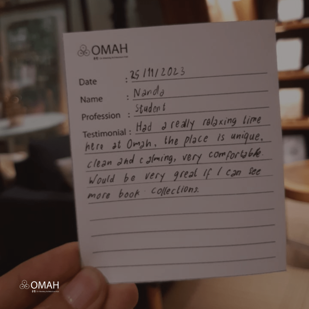 Had a really relaxing time here at Omah, the place is unique, clean and calming, very comfortable. Would be very great if i can see more book collections.