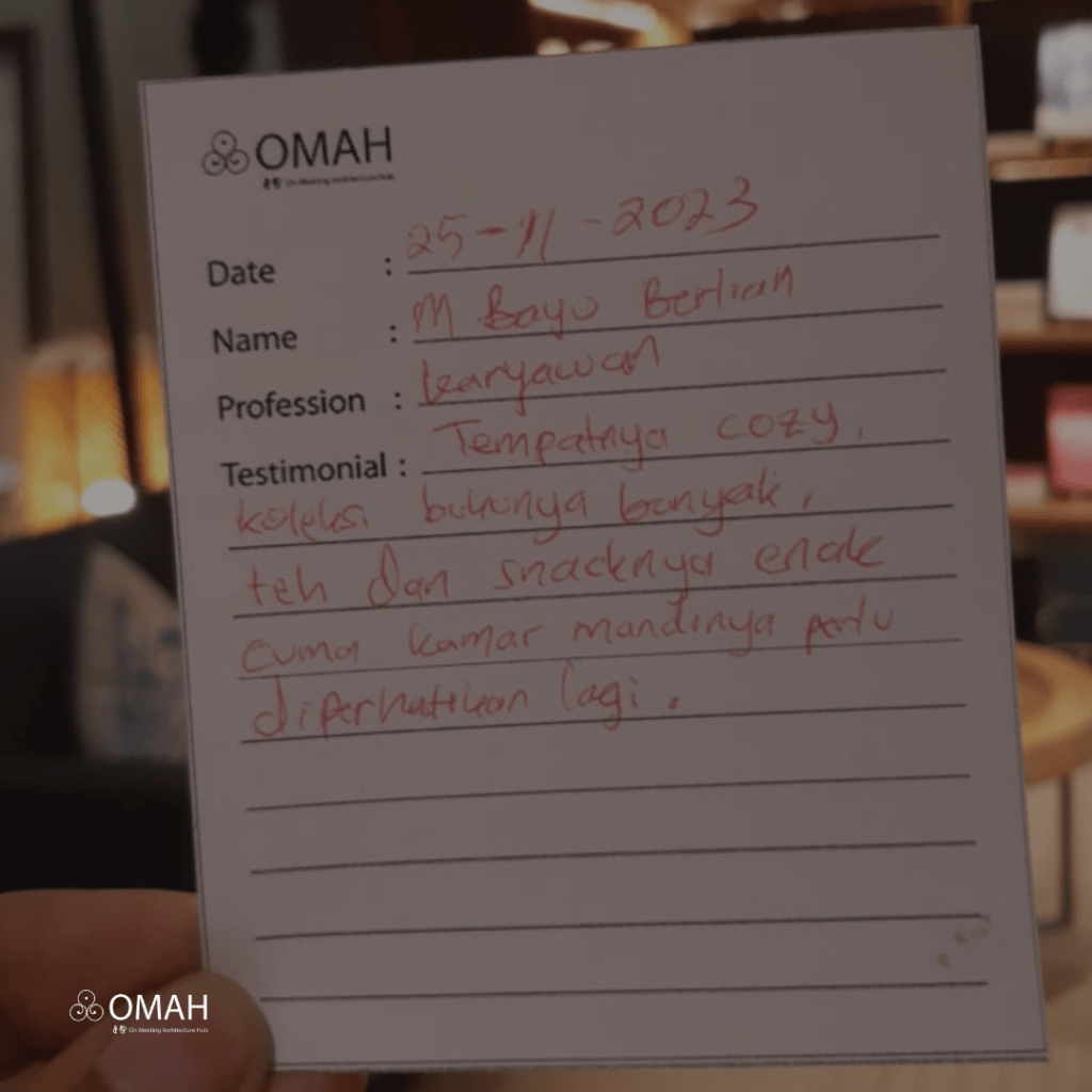 Tempatnya cozy, koleksi bukunya banyak, teh dan snacknya enak cuma kamar mandinya perlu diperhatikan lagi.