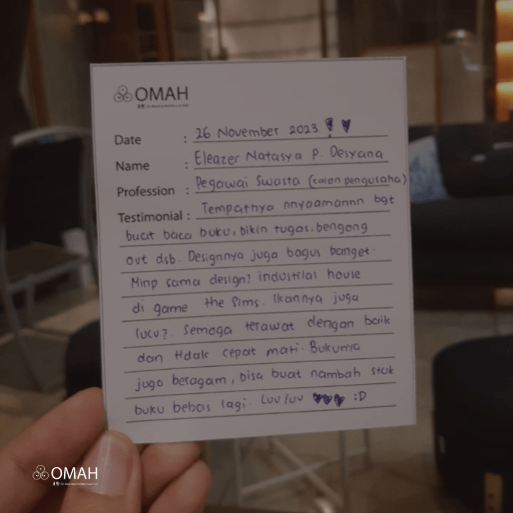 Tempatnya nynyaamannn bgt buat baca buku, bikin tugas, bengong ovt dsb. Designnya juga bagus banget. Mirip sama design industrial house di game the sims. Ikannya juga lucu-lucu. Semoga terawat dengan baik dan tidak cepat mati. Bukunya juga beragam, bisa buat nambah stok buku bebas lagi. luv luv.
