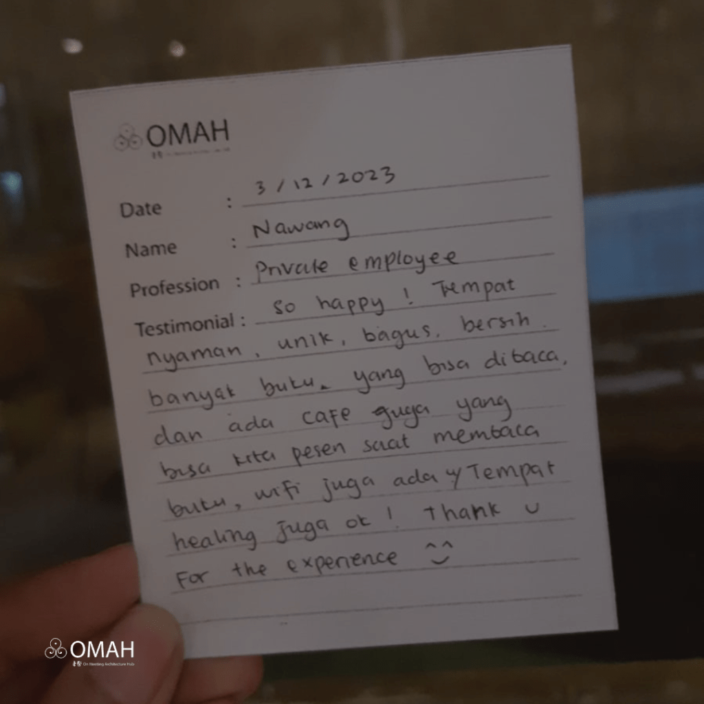 So happy ! Tempat nyaman, unik, bagus, bersih. Banyak buku yang bisa dibaca dan ada cafe juga yang bisa kita pesan saat membaca buku, wifi juga ada u/ tempat healing juga ok ! Thank u for the experience 🙂