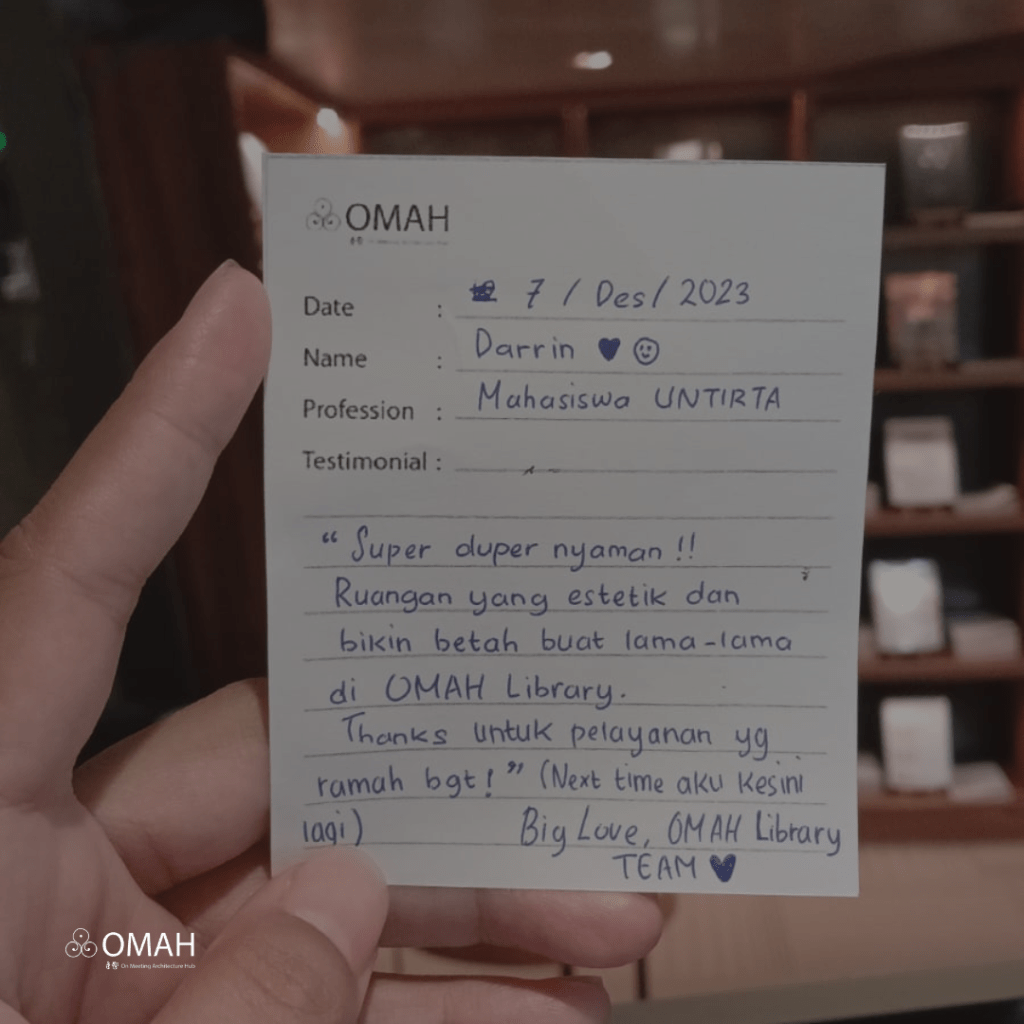 Super duper nyaman !! Ruangan yang estetik dan bikin betah buat lama-lama di Omah Library. Thanks untuk pelayanan yg ramah bgt ! ( Next time aku kesini lagi ) Big Love, OMAH Library TEAM