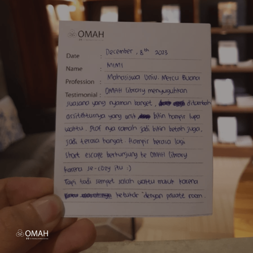 Omah library menyuguhkan suasana yang nyaman banget, ditambah arsitekturnya yang unik bikin hampir lupa waktu. Staf nya ramah jadi bikin betah juga, jadi terasa hangat. Hampir berasa lagi short escape berkunjung ke Omah Library karena se-cozy itu 🙂 Tapi tadi sempet salah satu waktu masuk karena ketukar dengan private room.