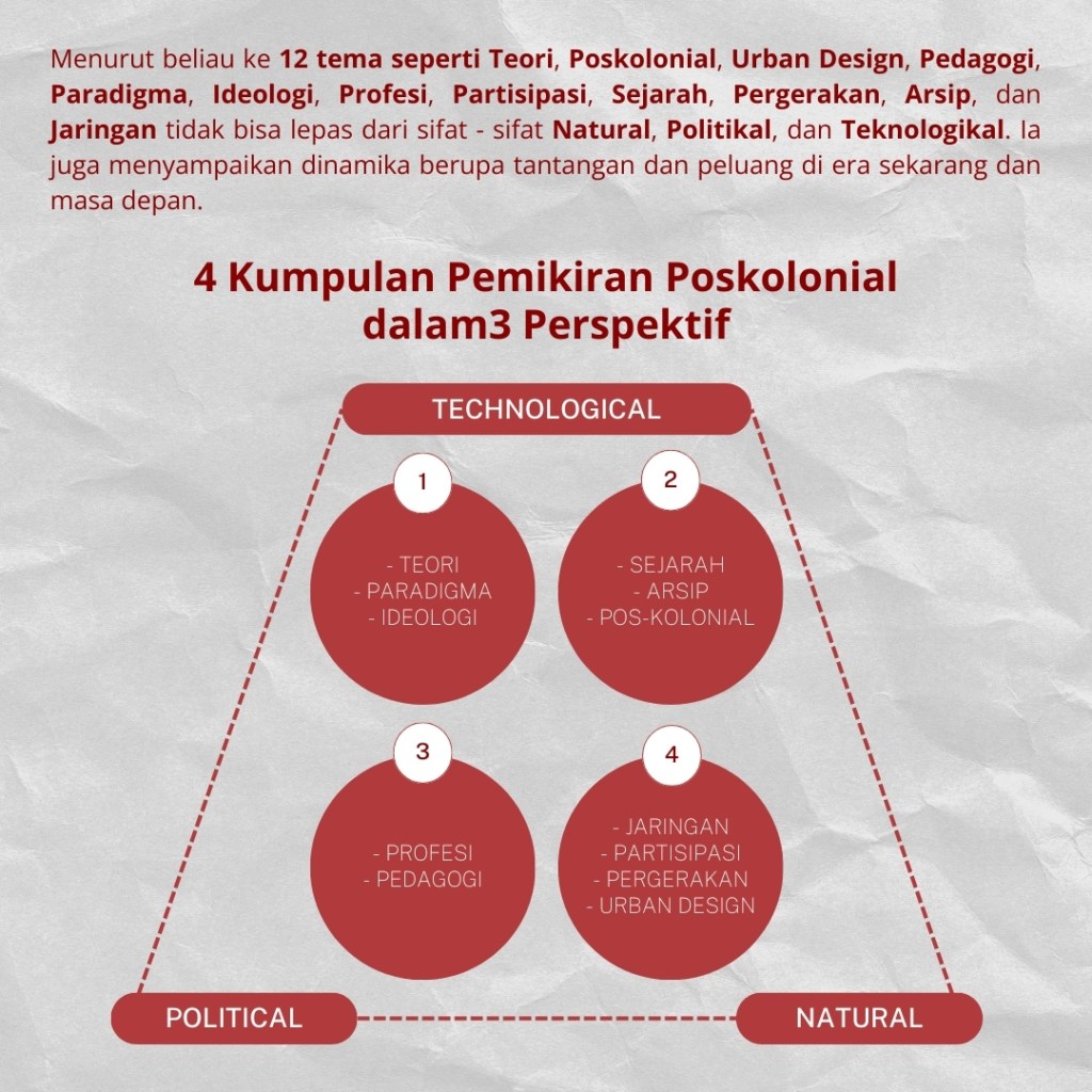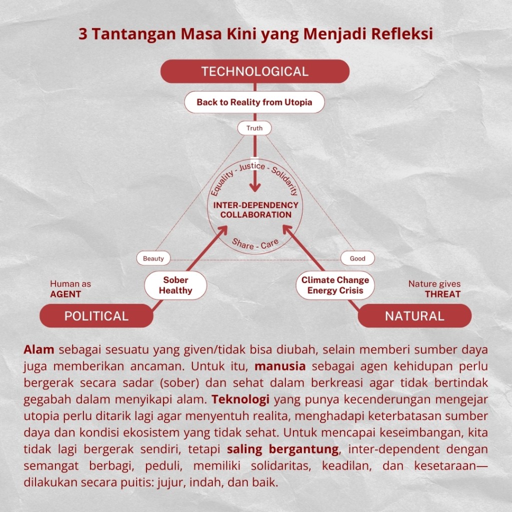 Kami menantang diri sendiri untuk mempertanyakan kondisi ekosistem arsitektur Indonesia saat ini, setelah 78 tahun merdeka. Tentunya dengan kolaborasi generasi-generasi berikutnya, yang memiliki peran vital dalam melanjutkan dan mengembangkan pengetahuan arsitektur, mencakup aspek Teori, Poskolonial, Urban Design, Pedagogi, Paradigma, Ideologi, Profesi, Partisipasi, Sejarah, Pergerakan, Arsip, dan Jaringan.