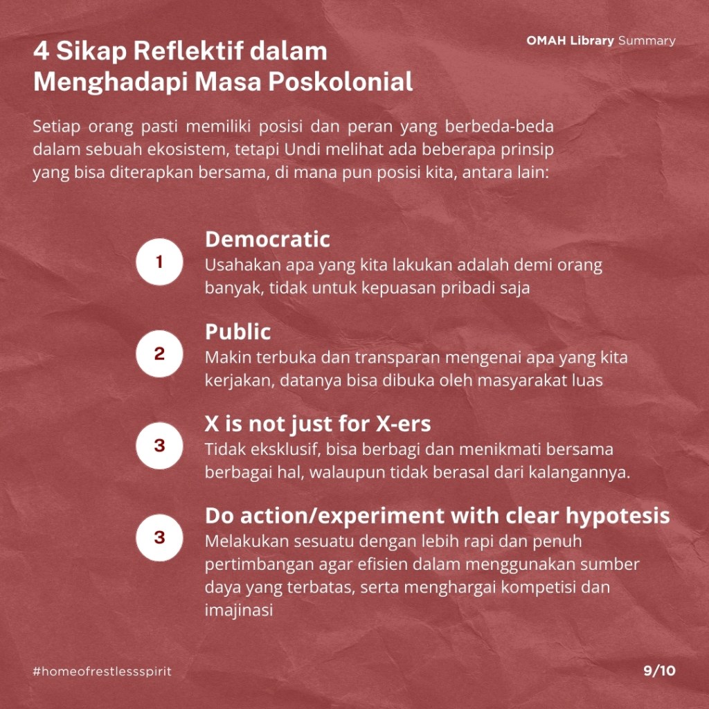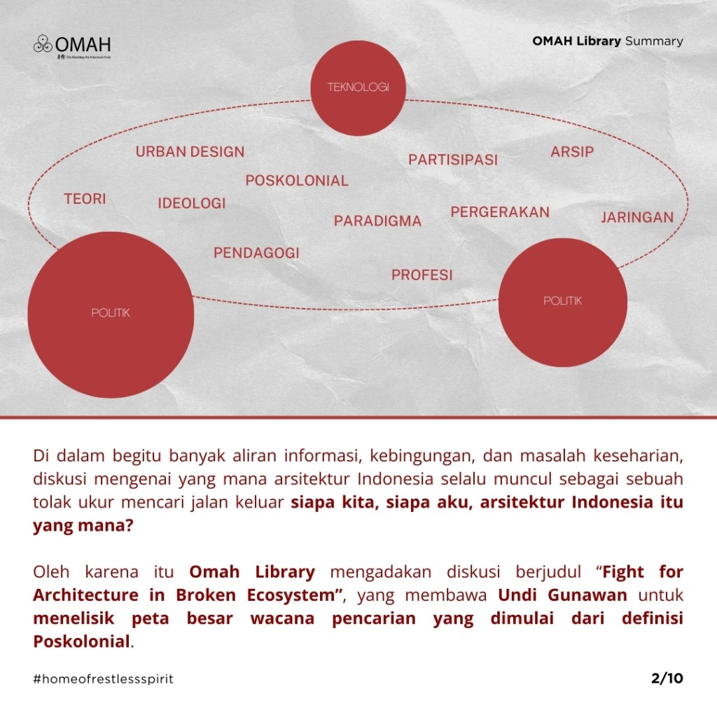 Oleh karena itu Omah Library mengadakan diskusi berjudul “Fight for Architecture in Broken Ecosystem” dengan 12 episode, yang kemudian membawa Undi Gunawan untuk menelisik peta besar wacana pencarian yang dimulai dari definisi Poskolonial.