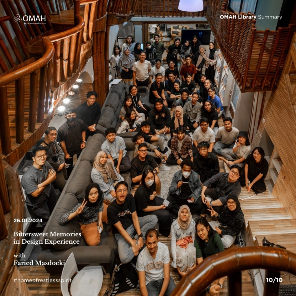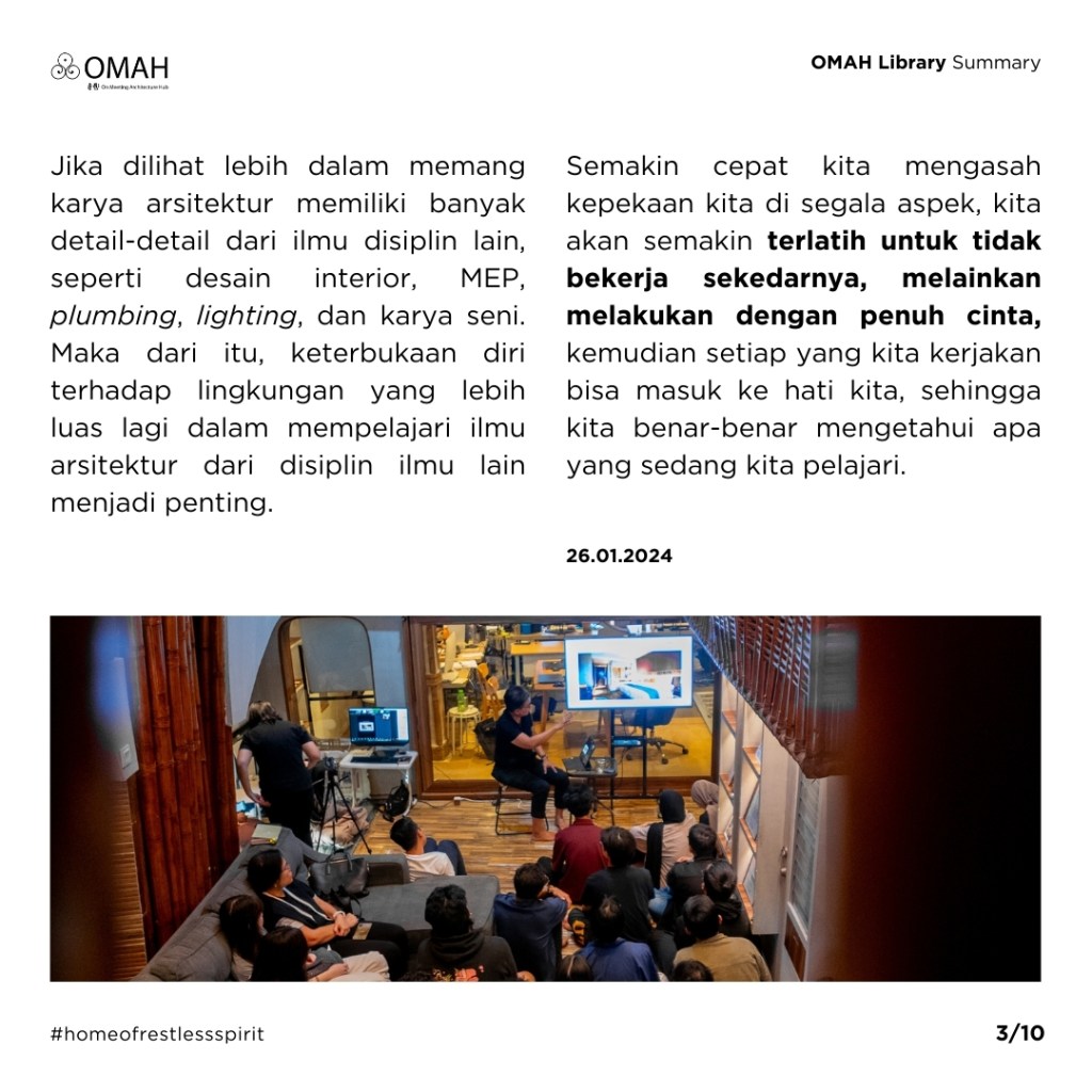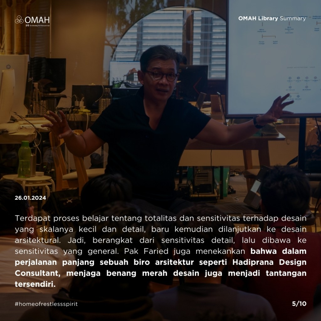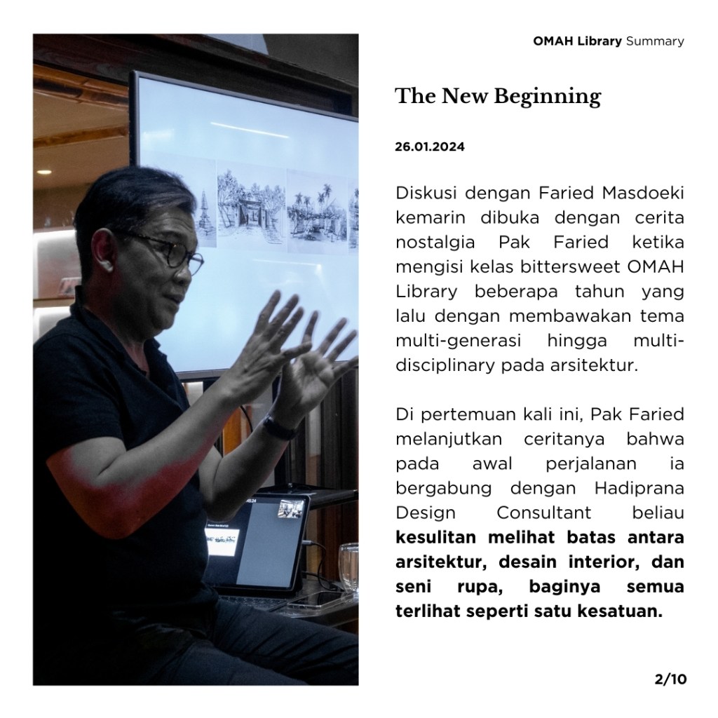 Diskusi dengan Pak @fariedms di @omahlibrary kemarin dibuka dengan cerita nostalgia Pak Faried ketika mengisi kelas Bittersweet Memories in Design Experience, OMAH Library beberapa tahun yang lalu dengan membawakan tema multi-generasi hingga multi-disciplinary pada arsitektur. Di pertemuan kali ini, Pak Faried melanjutkan ceritanya bahwa pada awal perjalanan ia bergabung dengan Hadiprana Design Consultant beliau kesulitan melihat batas antara arsitektur, desain interior, dan seni rupa, baginya semua terlihat seperti satu kesatuan. Jika dilihat lebih dalam memang karya arsitektur memiliki banyak detail-detail dari ilmu disiplin lain, seperti desain interior, MEP, plumbing, lighting, dan karya seni. Maka dari itu, keterbukaan diri terhadap lingkungan yang lebih luas lagi dalam mempelajari ilmu arsitektur dari disiplin ilmu lain menjadi penting. Semakin cepat kita mengasah kepekaan kita di segala aspek, kita akan semakin terlatih untuk tidak bekerja sekedarnya, melainkan melakukan dengan penuh cinta, kemudian setiap yang kita kerjakan bisa masuk ke hati kita, sehingga kita benar-benar mengetahui apa yang sedang kita pelajari. Menurut Pak Faried, di dalam berkarya kita perlu memiliki kacamata untuk melihat sesuatu dengan baik dan benar.