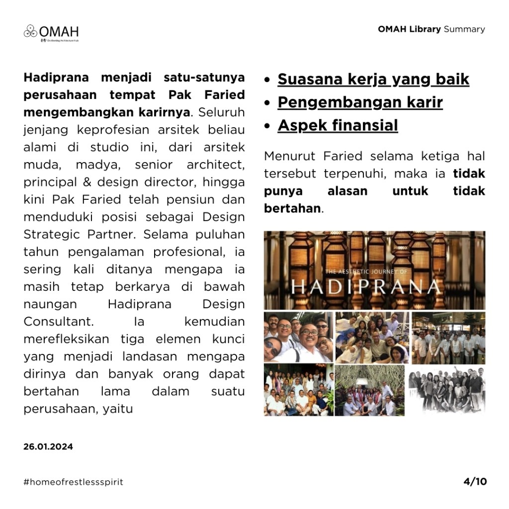 Hadiprana menjadi satu-satunya perusahaan tempat Pak Faried mengembangkan karirnya. Seluruh jenjang keprofesian arsitek beliau alami di studio ini, dari arsitek muda, madya, senior architect, principal & design director, hingga kini Pak Faried telah pensiun dan menduduki posisi sebagai Design Strategic Partner. Selama puluhan tahun pengalaman profesional, ia sering kali ditanya mengapa ia masih tetap berkarya di bawah naungan Hadiprana Design Consultant. Ia kemudian merefleksikan tiga elemen kunci yang menjadi landasan mengapa dirinya dan banyak orang dapat bertahan lama dalam suatu perusahaan, yaitu suasana kerja yang baik, pengembangan karir, dan finansial. Menurut beliau selama ketiga hal tersebut terpenuhi, maka tidak ada alasan untuk tidak bertahan.