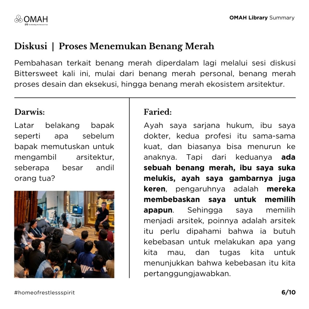 Pembahasan terkait benang merah diperdalam lagi melalui sesi diskusi Bittersweet kali ini, mulai dari benang merah personal, benang merah proses desain dan eksekusi, hingga benang merah ekosistem arsitektur. Pertanyaan personal ditanyakan oleh Darwis: “Dalam kecintaan Bapak terhadap seni, cerita-cerita Bapak yang filosofis untuk melatarbelakangi arsitektur yang bapak ciptakan, dan kecintaan bapak pada arsitektur sendiri yang membawa bapak sampai sekarang, kira-kira seberapa jauh andil keluarga dan latar belakang Bapak di sana?” Kemudian Pak Faried menjawab, “Saya berutung sih punya orang tua yang bukan arsitek. Ayah saya sarjana hukum, ibu saya dokter, kedua profesi itu sama-sama kuat, dan biasanya bisa menurun ke anaknya. Dokter kolegialnya kuat, kakek saya juga dokter, untungnya kakak saya juga jadi dokter, jadi sudah terputus di kakak saya dan saya bisa lebih bebas. Tapi dari keduanya ada sebuah benang merah, ibu saya suka melukis, ayah saya gambarnya juga keren, pengaruhnya adalah mereka membebaskan saya untuk memilih apapun. Sehingga saya memilih menjadi arsitek. Lalu kebetulan istri saya juga arsitek, kita bertemu di Hadiprana, dan dia bisa memahami ketika saya pulang larut atau bahkan pagi. Sekarang saya punya anak arsitek juga, dan harapannya dia bisa memahami saya juga. Nah, kembali ke pertanyaan tadi, pasti ada pengaruh dari keluarga dan latar belakang. Tapi poinnya bukan kesamaan profesi, melainkan bagaimana kita diberi kebebasan untuk melakukan apa yang kita mau, dan tugas kita untuk menunjukkan bahwa kebebasan itu kita pertanggungjawabkan.”