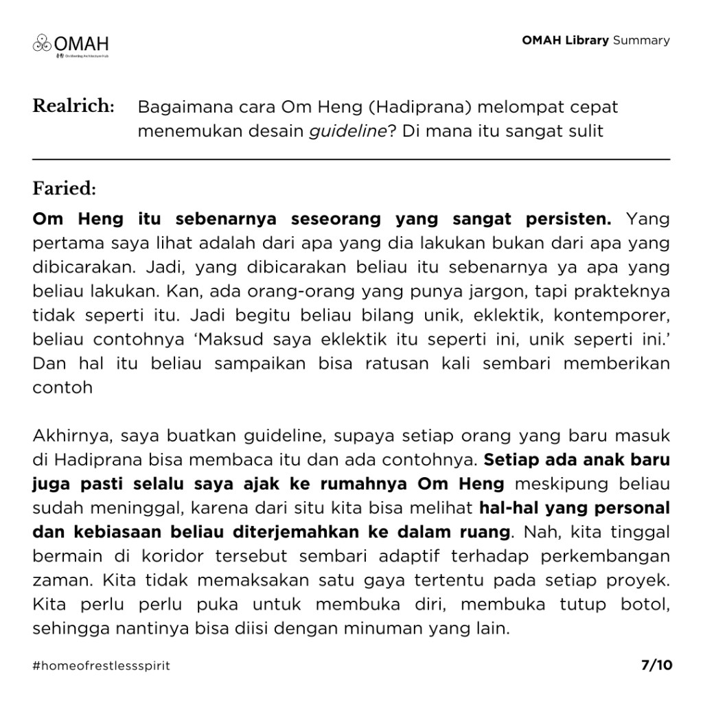 Pak Faried menjawab, “Kalau Om Heng itu sebenarnya seseorang yang sangat persisten. Yang pertama saya lihat adalah dari apa yang dia lakukan bukan dari apa yang dibicarakan. Jadi, yang dibicarakan beliau itu sebenarnya ya apa yang beliau lakukan. Kan, ada orang-orang yang punya jargon, tapi prakteknya tidak seperti itu. Jadi begitu beliau bilang unik, eklektik, kontemporer, beliau contohnya ‘Maksud saya eklektik itu seperti ini, unik seperti ini.’ Dan hal itu beliau sampaikan bisa ratusan kali sembari memberikan contoh. Dan dia sosok yang senang sekali memuji karya orang lain. Menurut saya kebesaran seorang arsitek itu ketika ia bisa memuji karya orang lain, itu another levelnya arsitek. Ketika kita memuji karya orang lain, sebenarnya kita sedang membuka diri untuk memperkaya pemahaman kita. Akhirnya, saya buatkan guideline, supaya setiap orang yang baru masuk di Hadiprana bisa membaca itu dan ada contohnya. Setiap ada anak baru juga pasti selalu saya ajak ke rumahnya Om Heng meskipung beliau sudah meninggal, karena dari situ kita bisa melihat hal-hal yang personal dan kebiasaan beliau diterjemahkan ke dalam ruang. Nah, kita tinggal bermain di koridor tersebut sembari adaptif terhadap perkembangan zaman. Kita tidak memaksakan satu gaya tertentu pada setiap proyek. Kita perlu perlu puka untuk membuka diri, membuka tutup botol, sehingga nantinya bisa diisi dengan minuman yang lain. Selain itu, Om Heng sering berpesan bahwa seorang arsitek harus pintar berstrategi dan berkomunikasi dalam menjawab kebutuhan client sehingga desain yang kita buat mengena di hati klien dan pengguna.”
