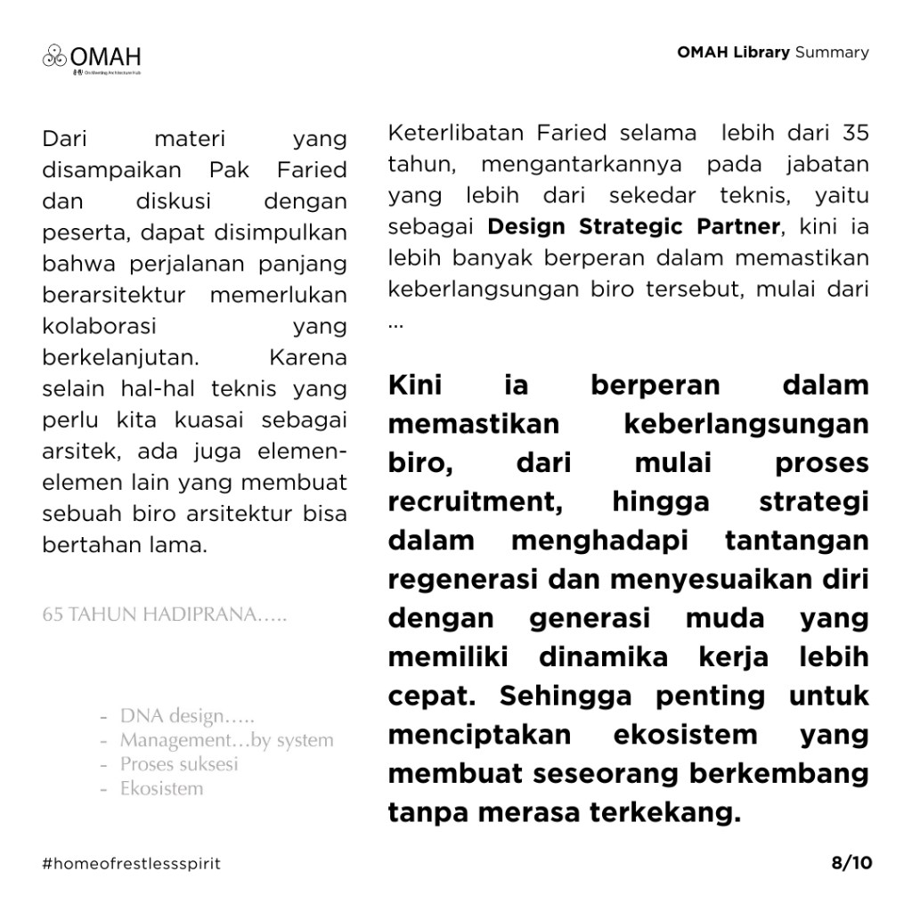 Dari materi yang disampaikan Pak Faried dan diskusi dengan peserta, dapat disimpulkan bahwa perjalanan panjang berarsitektur memerlukan kolaborasi yang berkelanjutan. Karena selain hal-hal teknis yang perlu kita kuasai sebagai arsitek, ada juga elemen-elemen lain yang membuat sebuah biro arsitektur bisa bertahan lama. Menurut refleksi Pak Faried, bisa ditarik kesimpulannya bahwa selama 65 tahun Hadiprana Design Consultant berdiri, Hadiprana berhasil menemukan DNA desainnya, menata sistem manajemen, menyusun proses suksesi timnya, serta merajut ekosistem di internal maupun eksternal. Kesetiaan serta keterlibatan Pak Faried selama kurang lebih 30 tahun, membuat dirinya menjadi titik vital yang menghubungkan benang merah multigenerasi di Hadiprana. Hal tersebut juga mengantarkannya pada jabatan yang lebih dari sekedar teknis, yaitu sebagai “Design Strategic Partner”. Kini ia berperan dalam memastikan keberlangsungan biro, dari mulai proses recruitment, hingga strategi dalam menghadapi tantangan regenerasi dan menyesuaikan diri dengan generasi muda yang memiliki dinamika kerja lebih cepat. Sehingga penting untuk menciptakan ekosistem yang membuat seseorang berkembang tanpa merasa terkekang.