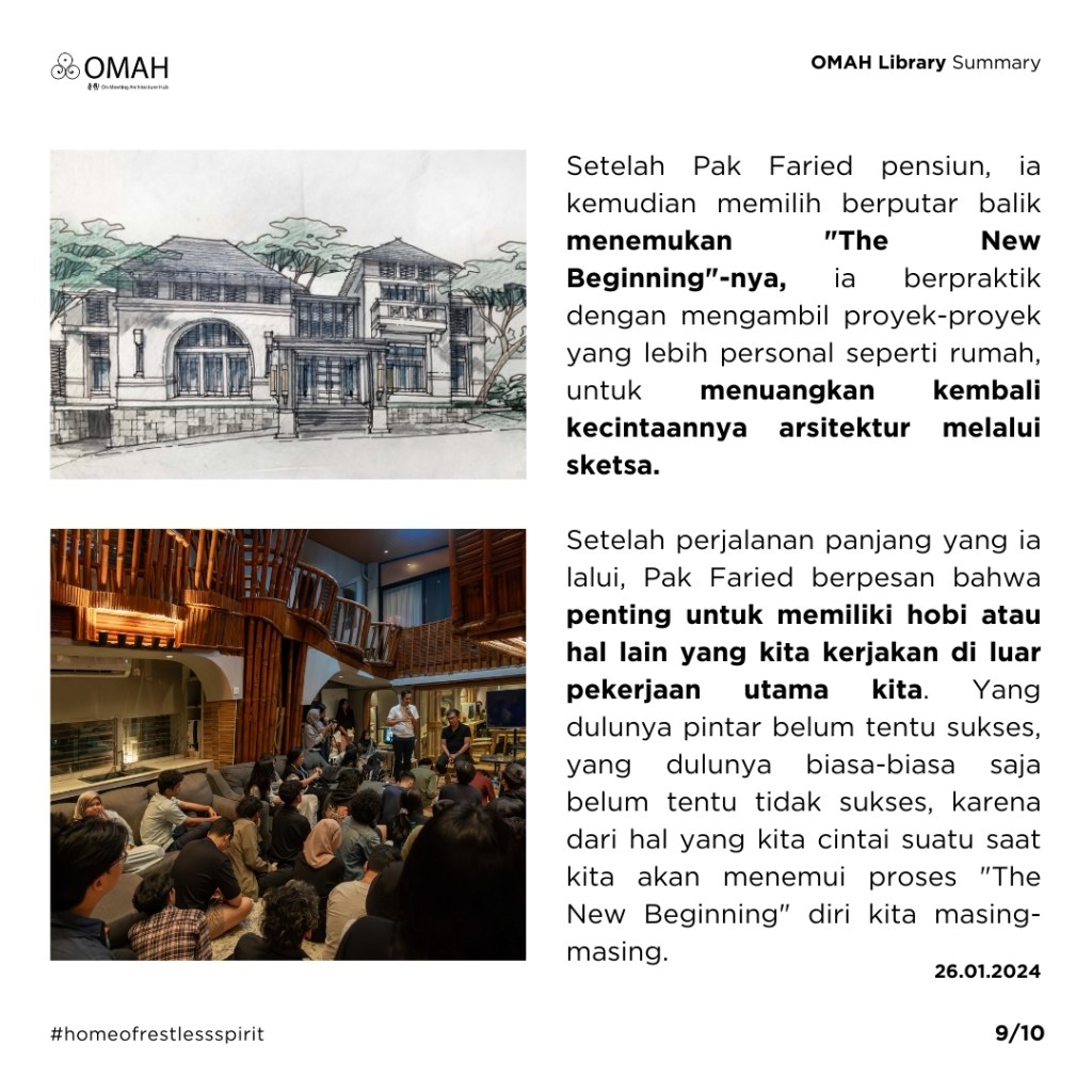 Setelah Pak Faried pensiun, ia kemudian memilih berputar balik menemukan “The New Beginning”-nya, ia berpraktik dengan mengambil proyek-proyek yang lebih personal seperti rumah, untuk menuangkan kembali kecintaannya arsitektur melalui sketsa. Setelah perjalanan panjang yang ia lalui, Pak Faried berpesan bahwa penting untuk memiliki hobi atau hal lain yang kita kerjakan di luar pekerjaan utama kita. Yang dulunya pintar belum tentu sukses, yang dulunya biasa-biasa saja belum tentu tidak sukses, karena dari hal yang kita cintai suatu saat kita akan menemui proses “The New Beginning” diri kita masing-masing.