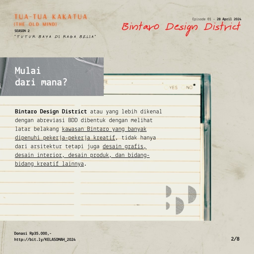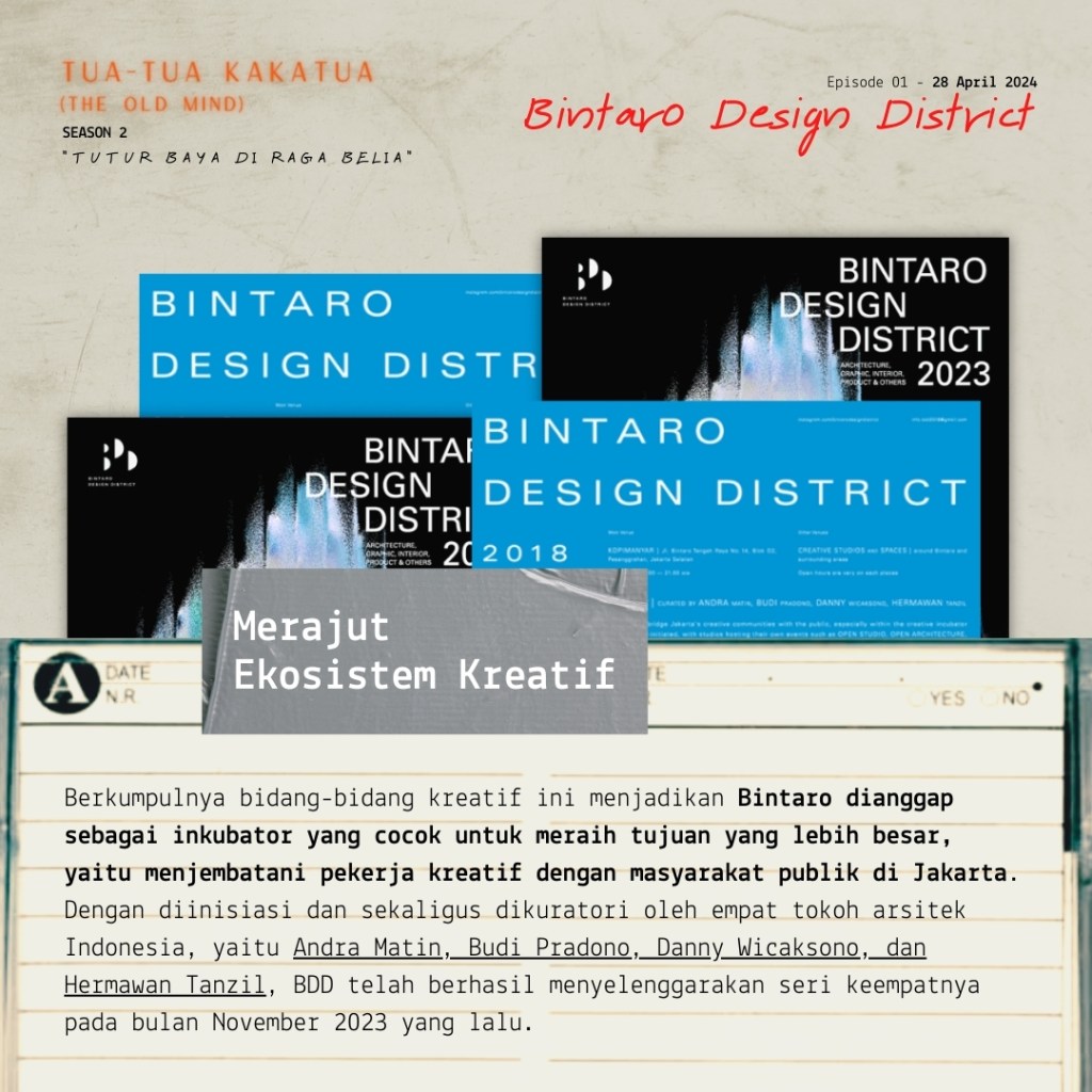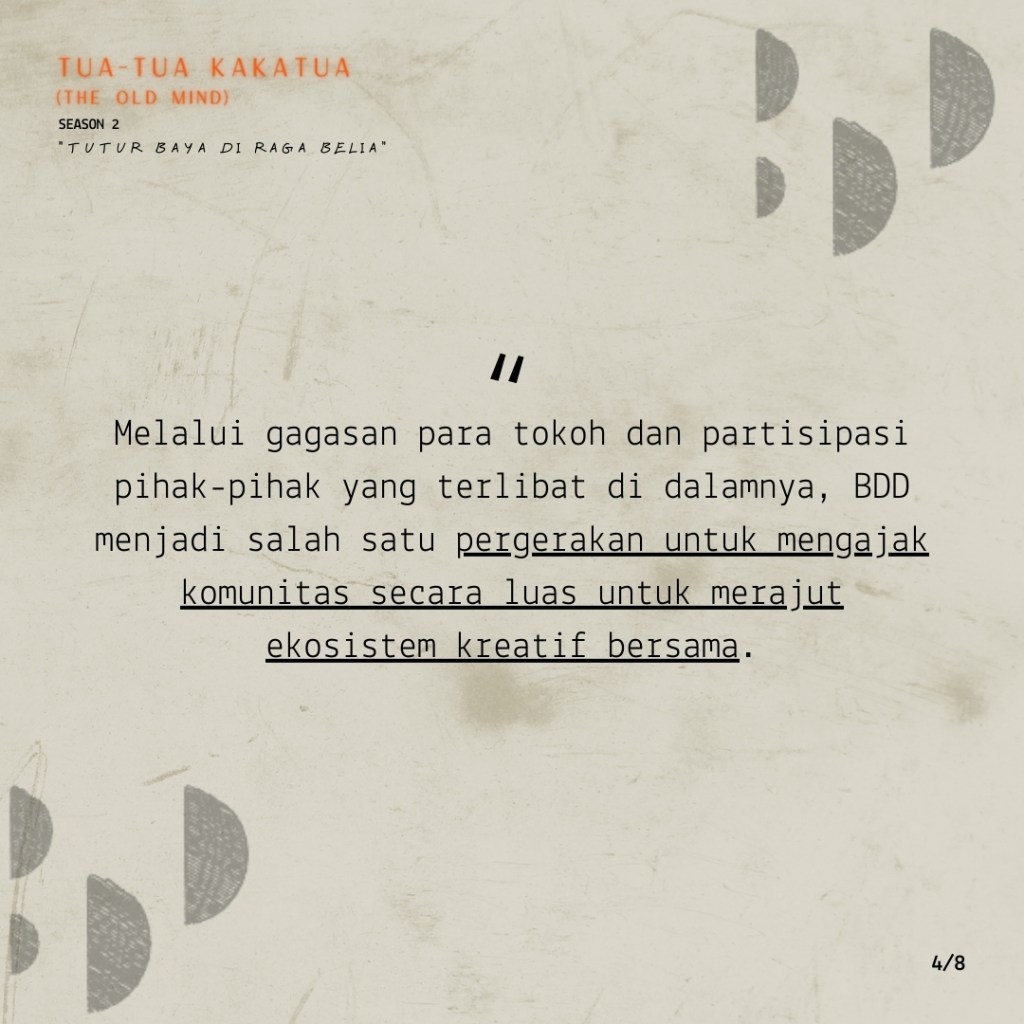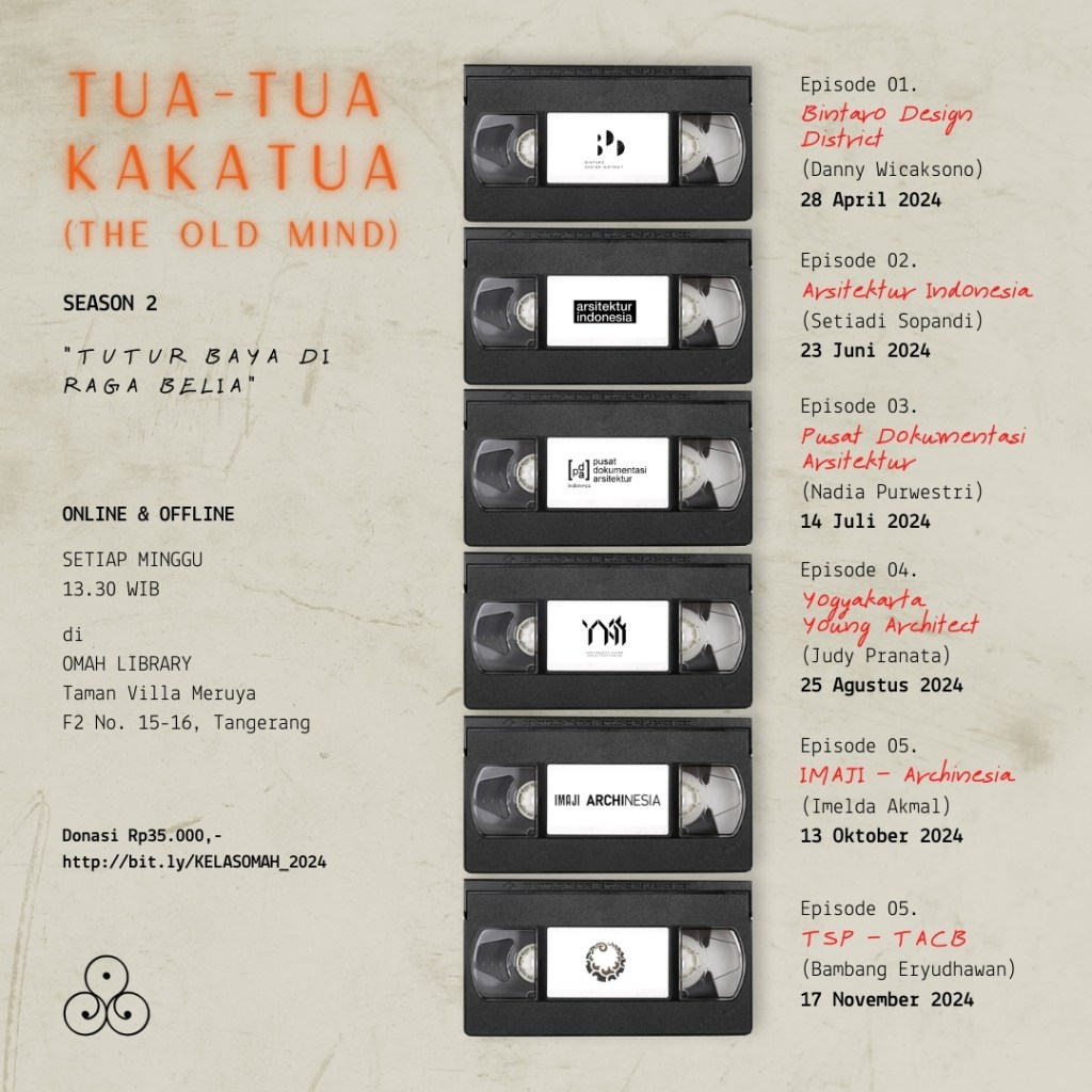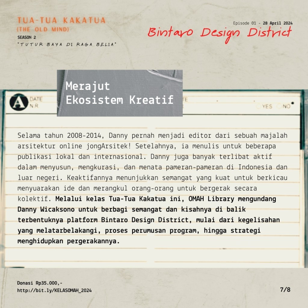 Keaktifan Danny menulis dan terlibat dalam event-event menunjukkan semangat yang kuat untuk berkicau menyuarakan ide dan merangkul orang-orang untuk bergerak secara kolektif. Melalui kelas Tua-Tua Kakatua, OMAH Library mengundang Danny Wicaksono untuk berbagi semangatnya tersebut dan berbagi kisah di balik terbentuknya platform Bintaro Design District, mulai dari kegelisahan yang melatarbelakangi, proses perumusan program, hingga strategi menghidupkan pergerakannya.