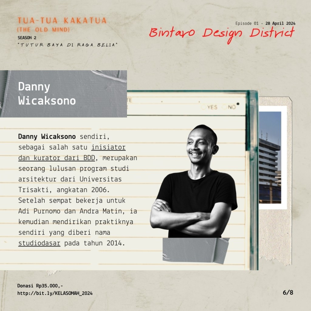 Sebagai salah satu pendiri BDD, @dnnywcksn sendiri merupakan lulusan arsitektur dari Universitas Trisakti, angkatan 2006. Setelah sempat bekerja untuk Adi Purnomo dan Andra Matin, ia mendirikan praktik sendiri yang diberi nama studiodasar pada tahun 2014. Selama tahun 2008-2014 juga, Danny pernah menjadi salah satu editor dari sebuah majalah arsitektur online bernama jongArsitek! Setelahnya, ia menulis untuk beberapa publikasi lokal dan internasional. Di samping itu, Danny juga banyak terlibat aktif dalam penyusunan, pengkurasian, serta penataan pameran-pameran di Indonesia dan luar negeri.