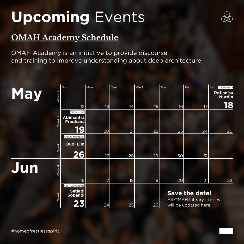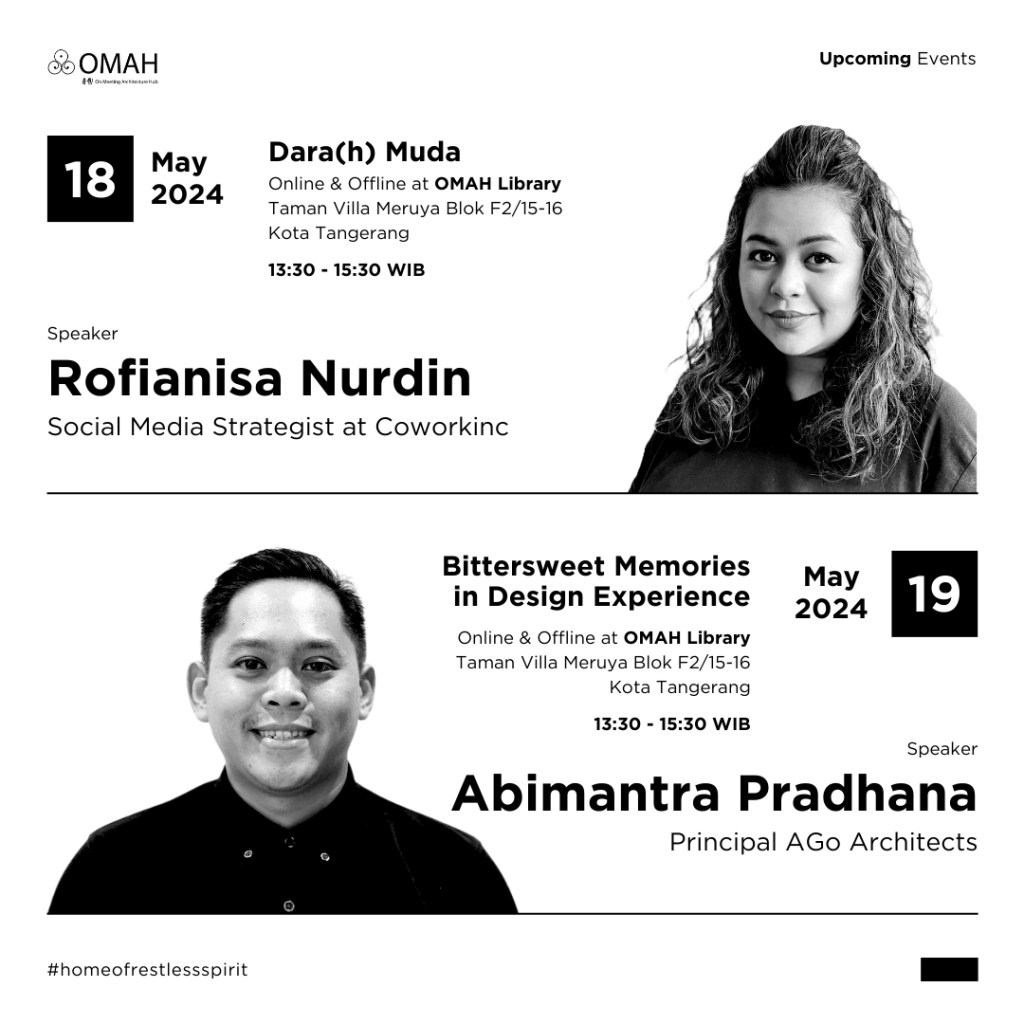Melalui budaya studio kami tersebut dan antusias teman-teman terutama dari kalangan arsitektur, @rumaharsitekturindonesia dan @omahlibrary merencanakan beberapa kelas dengan tema dan pembicara yang berbeda-beda sepanjang tahun 2024. Harapannya, melalui kelas-kelas ini teman-teman bisa mendapatkan perspektif dan semangat baru dalam berarsitektur. Berikut beberapa kelas yang akan diadakan selama bulan Mei-Juni:
