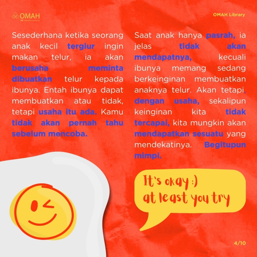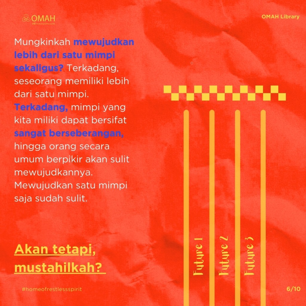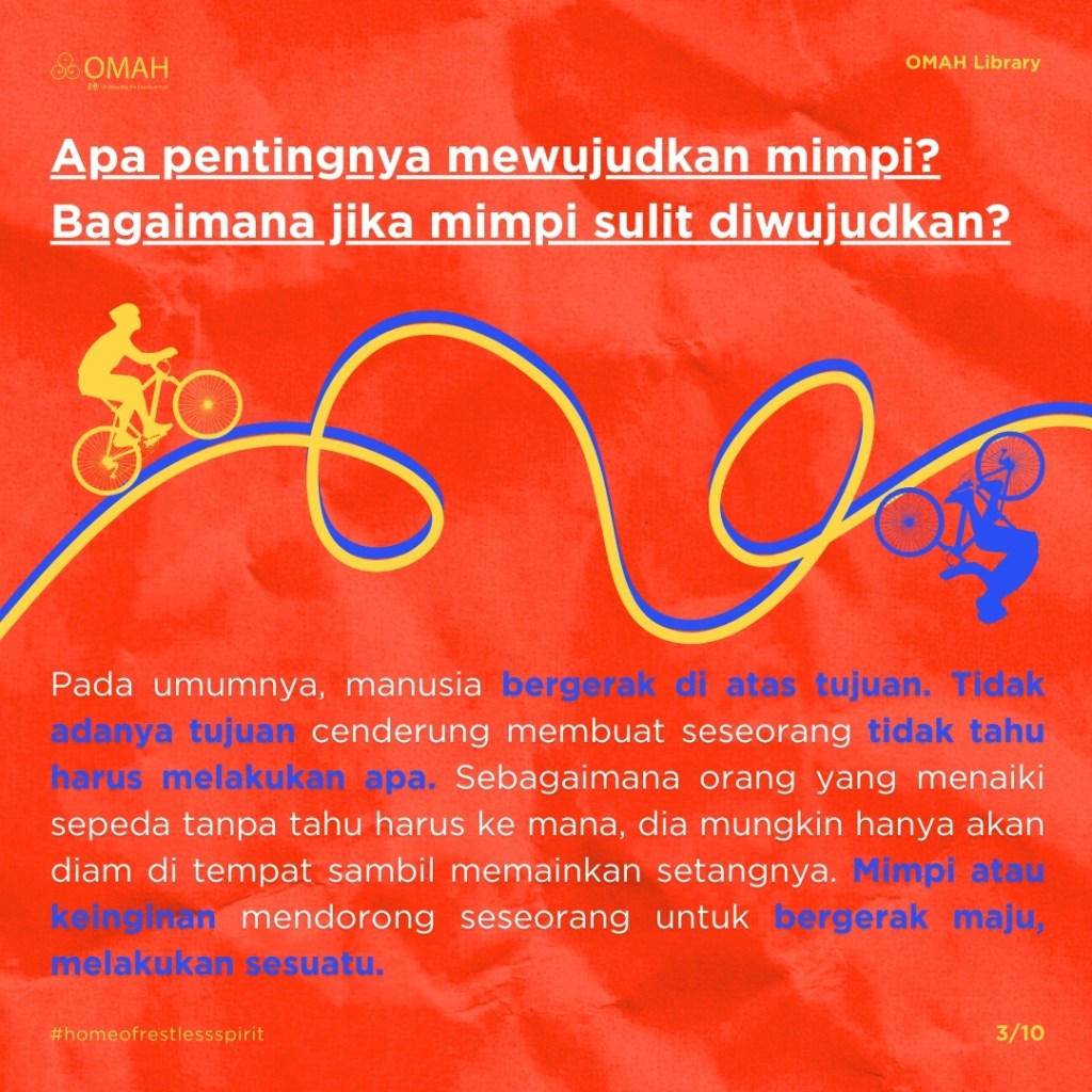 Pada umumnya, manusia bergerak di atas tujuan. Tidak adanya tujuan cenderung membuat seseorang tidak tahu harus melakukan apa. Mimpi mendorong seseorang untuk bergerak maju, melakukan sesuatu. Lalu, bagaimana jika mimpi sulit dicapai? Kita tidak akan tahu sebelum mencoba. Pasrah tidak akan menghasilkan apa-apa. Dengan usaha, kita mungkin bisa mewujudkannya atau setidaknya mendapatkan sesuatu yang mendekati.