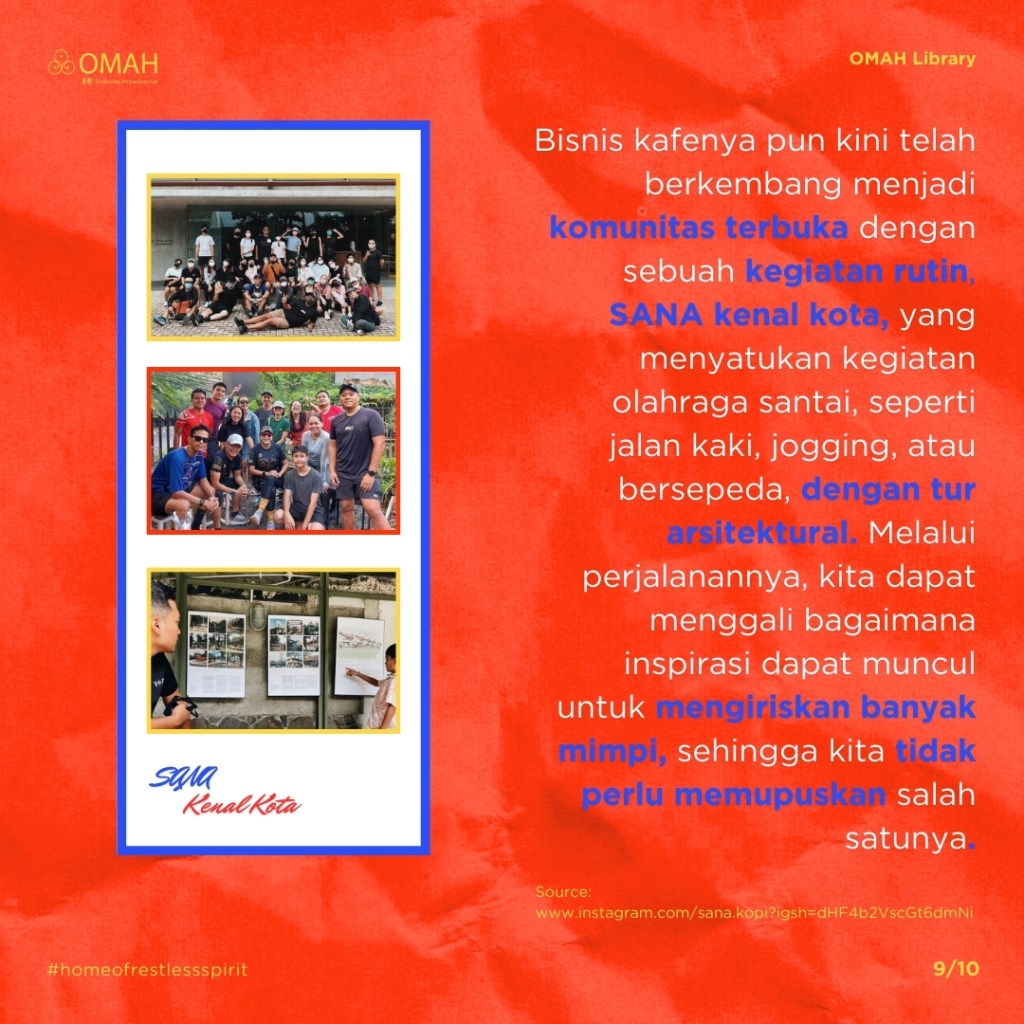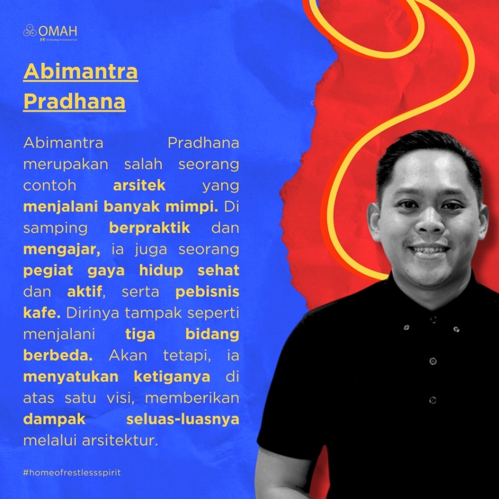 Abimantra Pradhana merupakan salah seorang arsitek yang menjalani banyak mimpi. Di samping berpraktik dan mengajar, ia juga seorang pegiat gaya hidup sehat dan pebisnis kafe. Dirinya tampak menjalani tiga bidang berbeda. Akan tetapi, ia menyatukannya di atas satu visi, memberikan dampak seluas-luasnya melalui arsitektur. Bisnis kafenya pun kini telah berkembang menjadi komunitas terbuka dengan sebuah kegiatan rutin, SANA kenal kota, yang menyatukan kegiatan olahraga santai dengan tur arsitektural. Apa yang melatarbelakangi mimpi-mimpi Abimantra? Apa yang menginspirasinya untuk mengiriskan mimpi-mimpinya?
