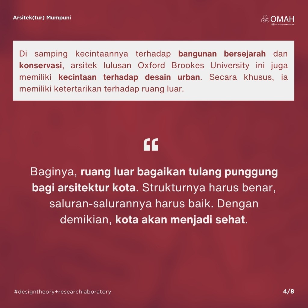 Di samping kecintaannya terhadap konservasi bangunan bersejarah, arsitek lulusan Oxford Brookes University ini juga memiliki kecintaan terhadap desain urban, khususnya ruang luar. Baginya, ruang luar bagaikan tulang punggung arsitektur kota. Strukturnya harus benar, saluran-salurannya harus baik. Dengan demikian, kota akan menjadi sehat.