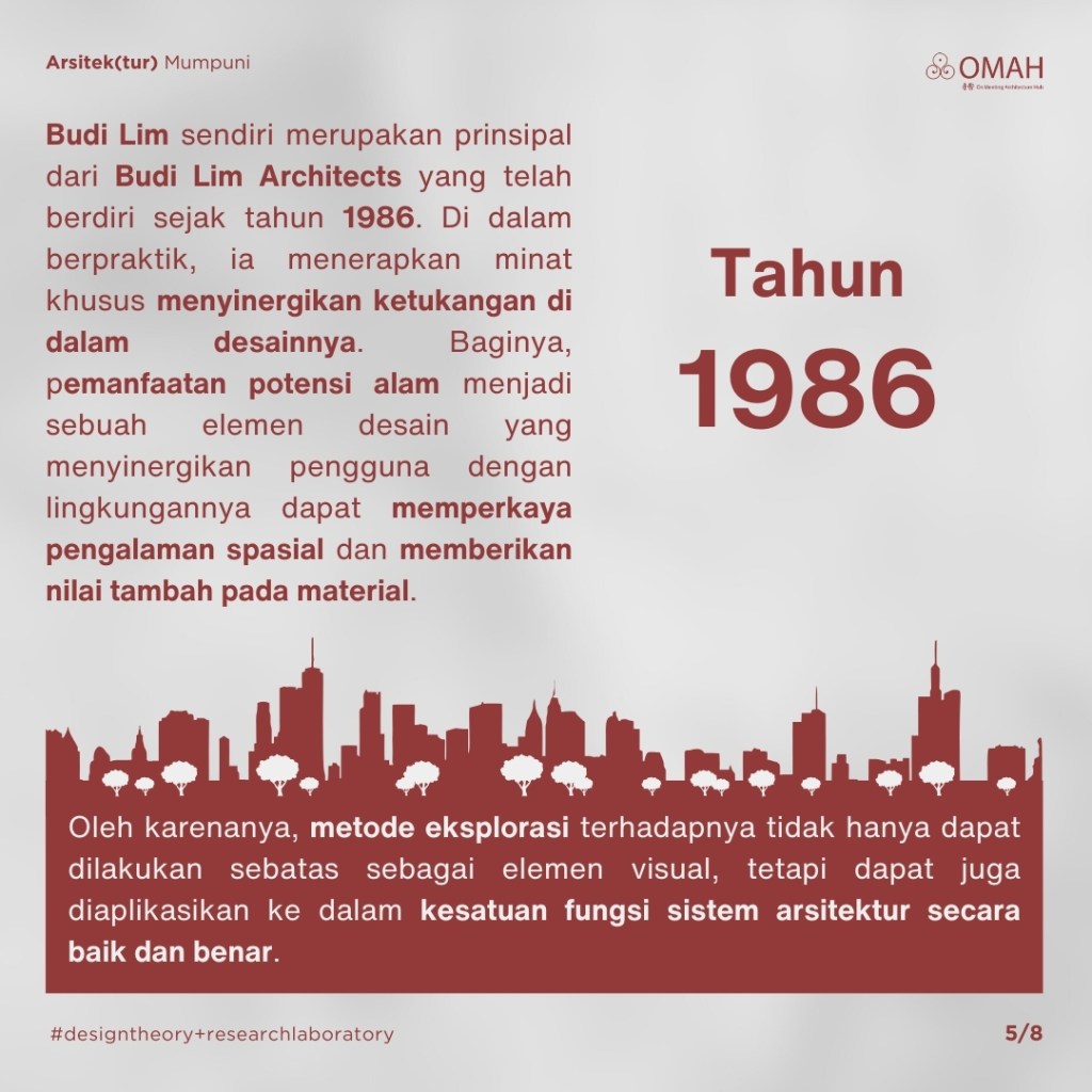 Budi Lim sendiri merupakan prinsipal dari Budi Lim Architects yang telah berdiri sejak tahun 1986. Di dalam berpraktik, ia menerapkan minat khusus menyinergikan ketukangan di dalam desain. Baginya, pemanfaatan potensi alam menjadi sebuah elemen desain yang menyinergikan pengguna dengan lingkungannya dapat memperkaya pengalaman spasial dan memberikan nilai tambah pada material. Oleh karenanya, metode eksplorasi terhadapnya tidak hanya dapat diaplikasikan sebatas sebagai elemen visual, tetapi juga ke dalam kesatuan fungsi sistem arsitektur secara baik dan benar.