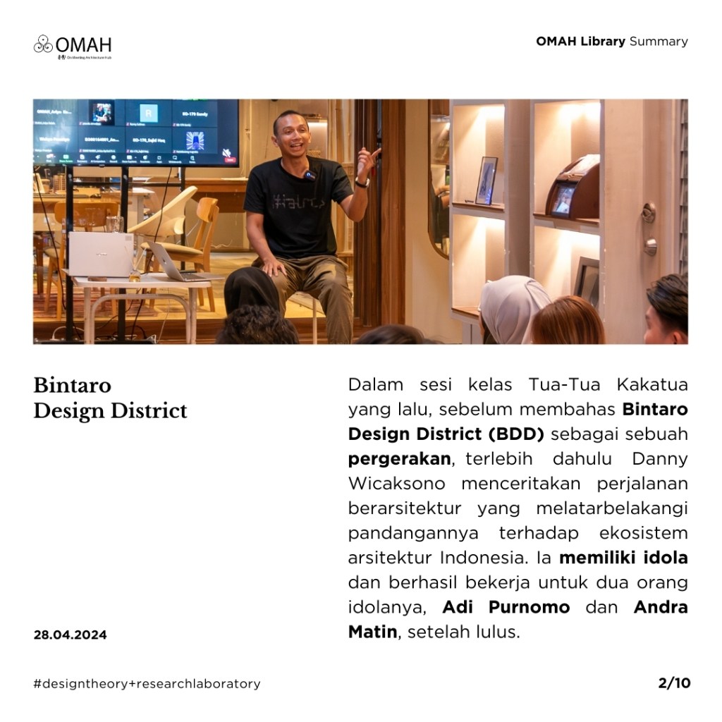 Dalam sesi kelas Tua-Tua Kakatua yang lalu, sebelum membahas Bintaro Design District (BDD) sebagai sebuah pergerakan, terlebih dahulu Danny Wicaksono menceritakan perjalanan berarsitektur yang melatarbelakangi pandangannya terhadap ekosistem arsitektur Indonesia. Ia memiliki idola dan berhasil bekerja untuk dua orang idolanya, Adi Purnomo dan Andra Matin, setelah lulus.